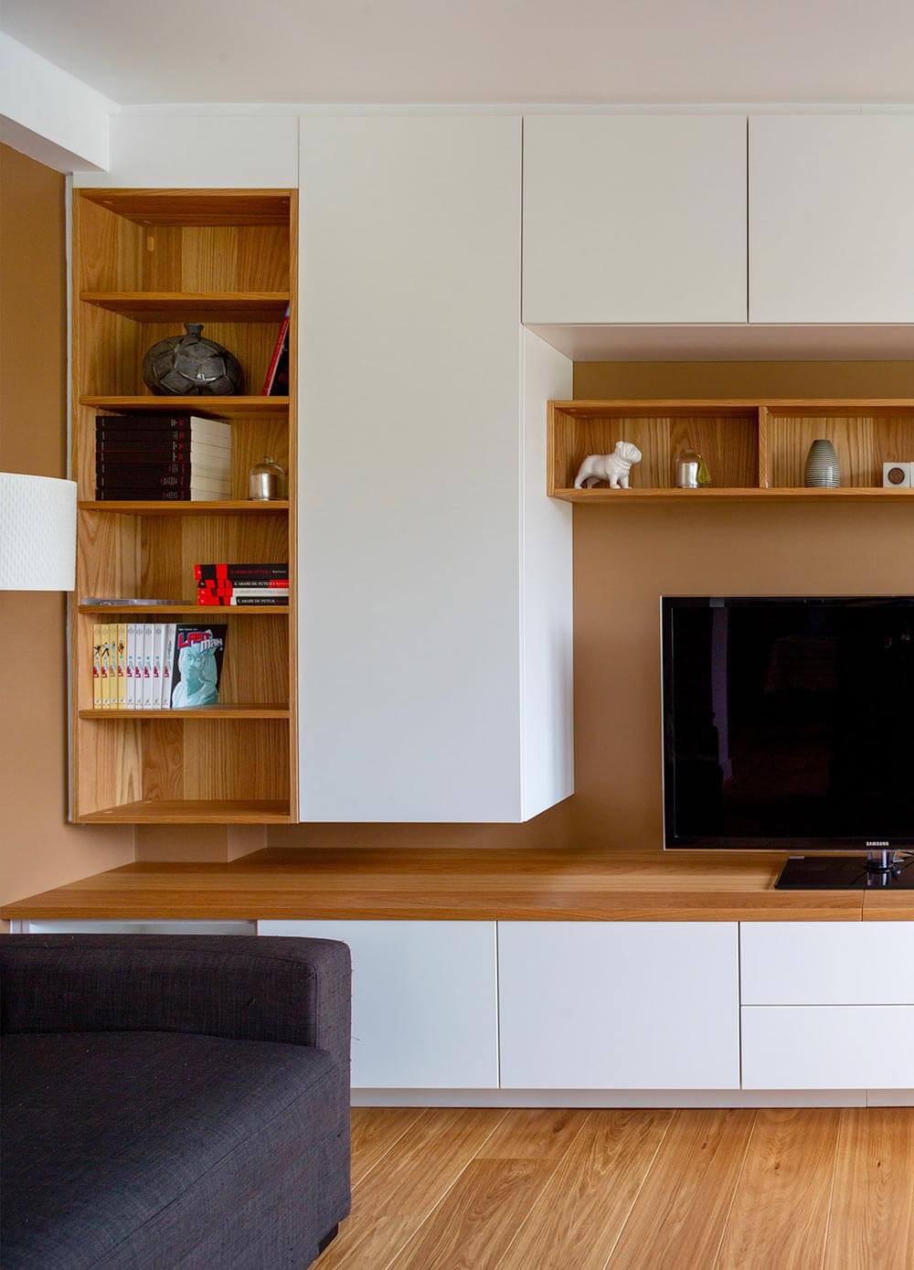 Le meuble TV bibliothèque sur mesure est parfait pour ceux qui souhaitent combiner rangement pour livres et espace télévisuel. Cela crée un point focal unique dans votre salon, optimisant l’espace tout en personnalisant votre décoration.