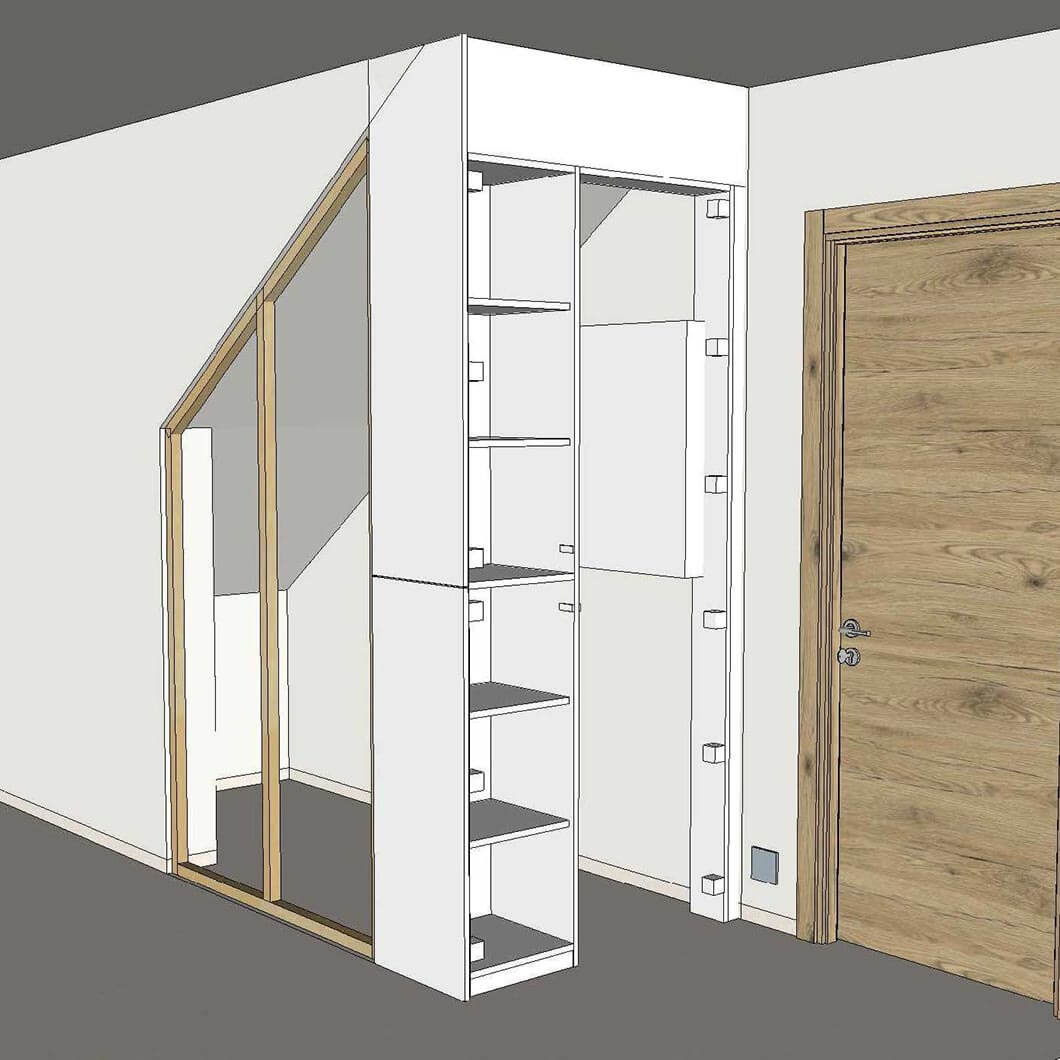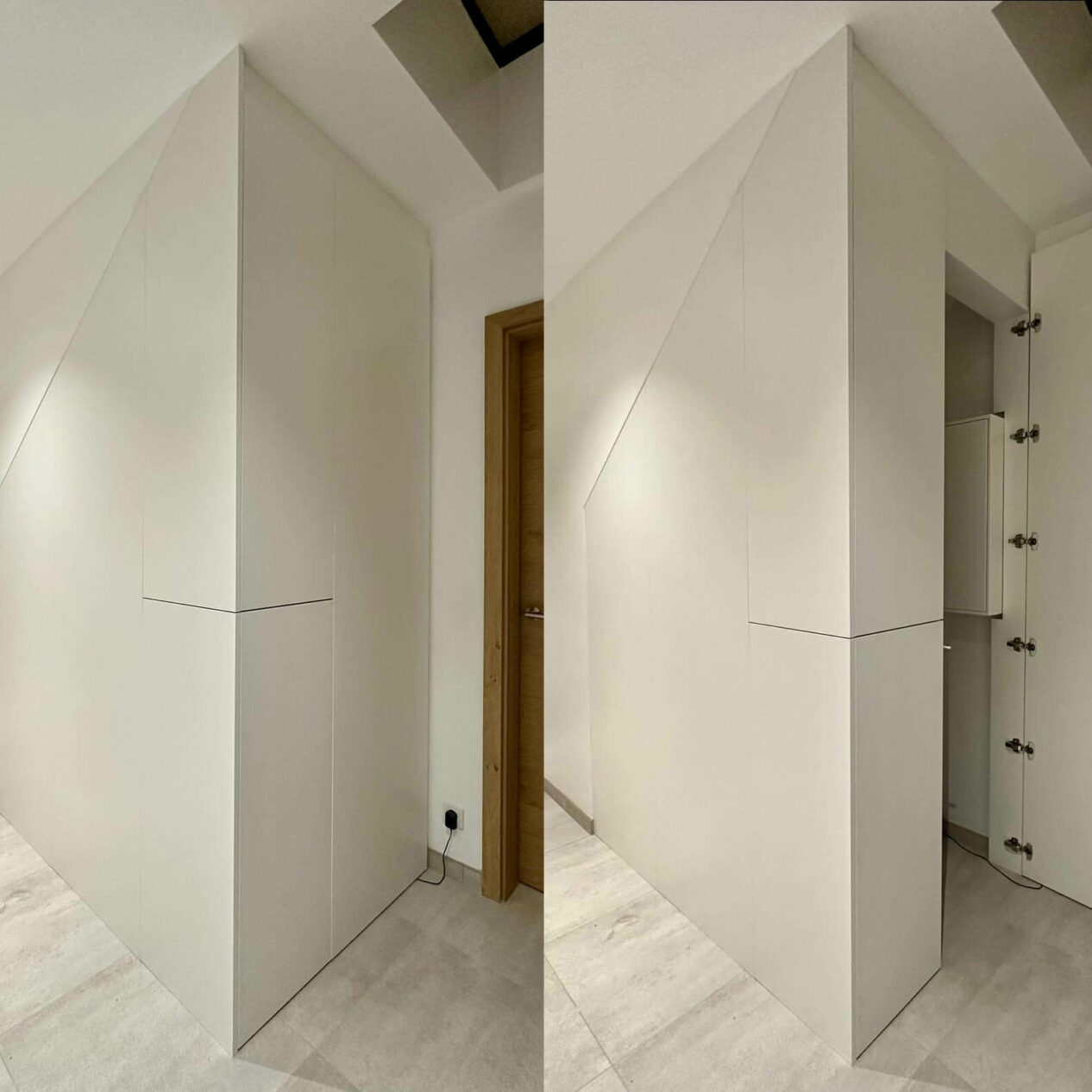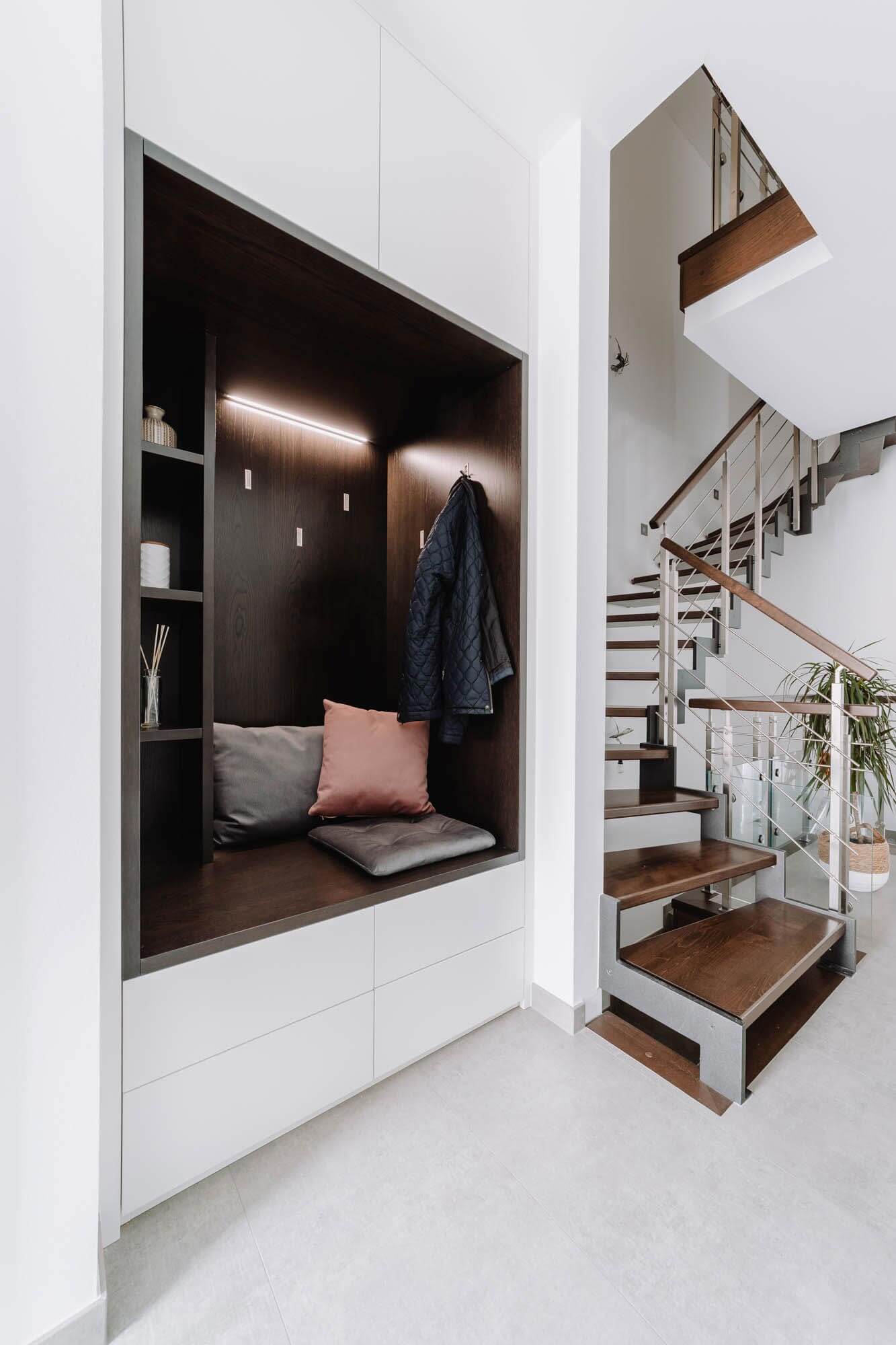 Dans cette entrée de maison en périphérie de Lausanne, une grande surface non exploitée entraînait un bazar permanent au sol. L’aménagement d’un meuble sur mesure a permis de combler le vide sous la pente et ainsi de procurer du rangement. Le choix des façades blanches permet de s’intégrer dans le style de l’entrée.