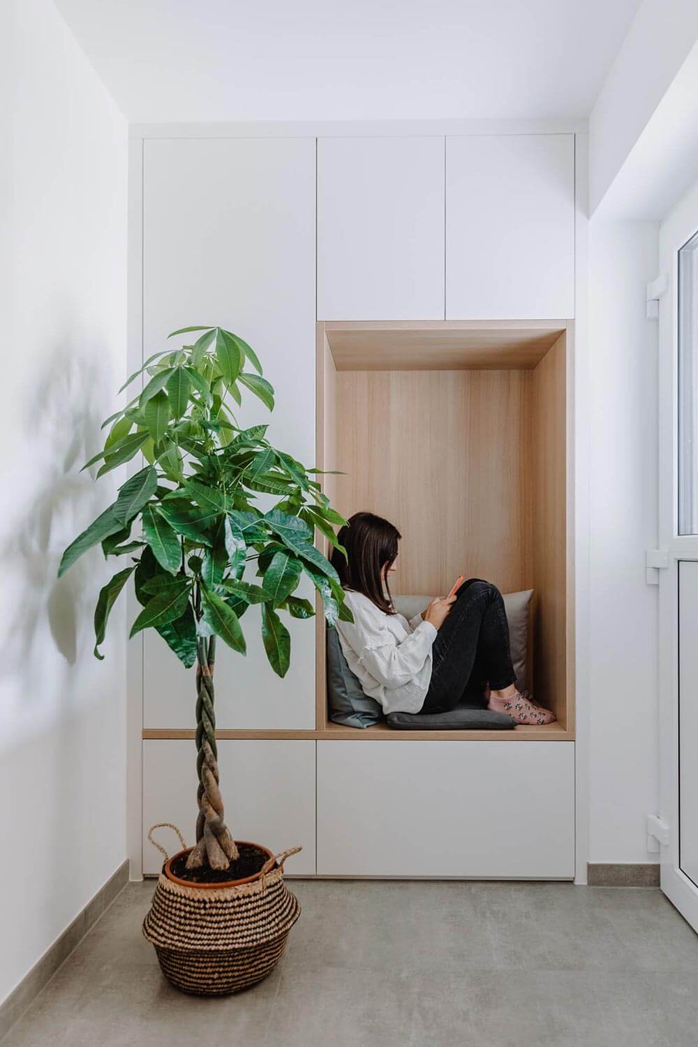 L’aménagement de cette entrée à Lemont-sur-Lausanne a donné lieu à un meuble toute hauteur très élégant. L’entrée reste lumineuse grâce à la blancheur des façades, et l’idée de la niche offre un vrai confort pour s’asseoir un instant, enlever ses chaussures et même s’y loger pour lire ou jouer.