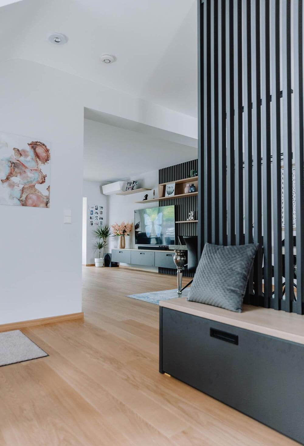 OK, le hall de cette maison à Belmont-sur-Lausanne est très spacieux. Mais l’aménagement d’entrée sur mesure s’adapte réellement à TOUTES les surfaces, et apporte à chacune du volume de rangement, des espaces pratiques et peut être très élégant dans tous les cas. Faites confiance à nos agenceurs pour cela. Le claustra qui prolonge le meuble sert de séparation sans occulter la lumière naturelle.
