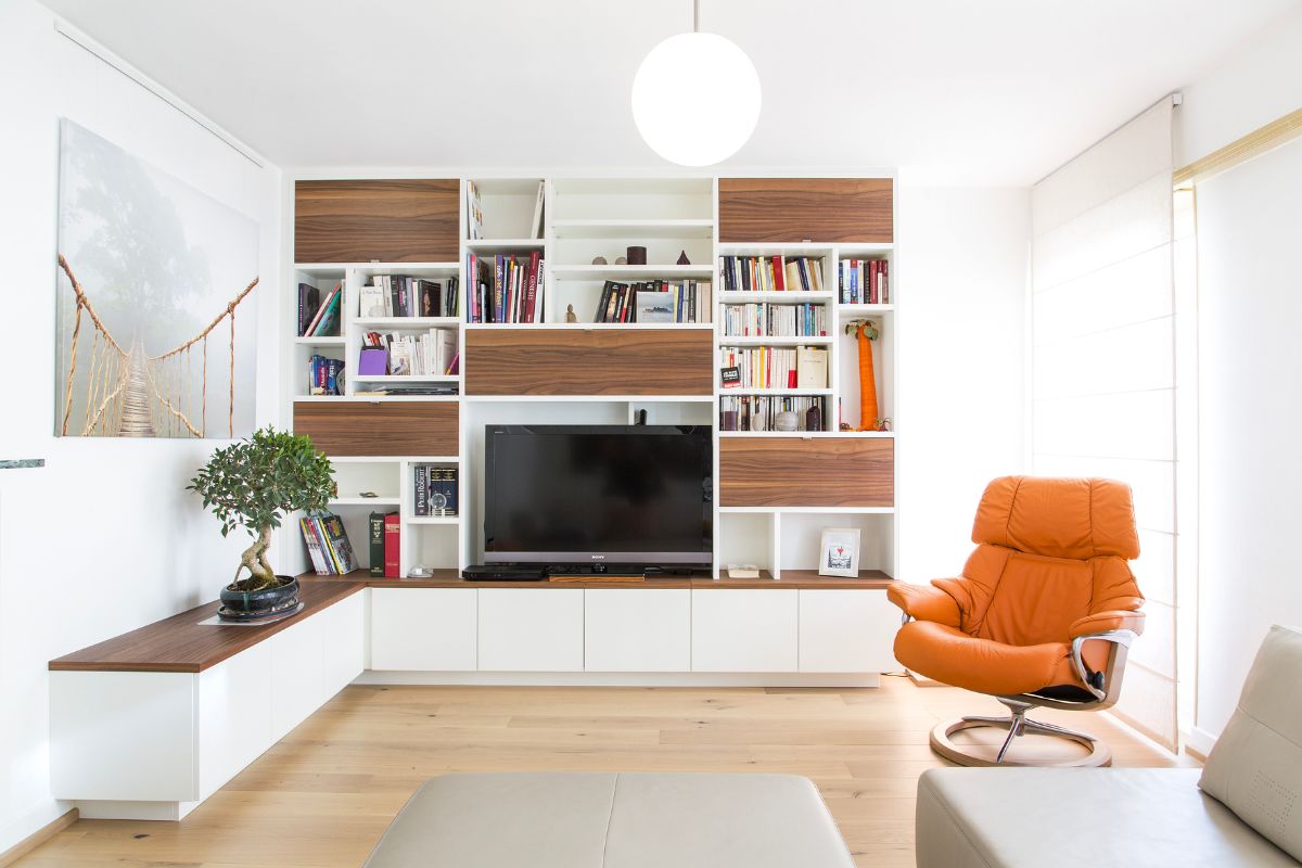 - L’espace est optimisé : une bibliothèque sur mesure épouse les lignes du mur et s’adapte aussi à votre sol qui n’est (certainement) pas tout à fait droit, surtout dans des logements anciens.