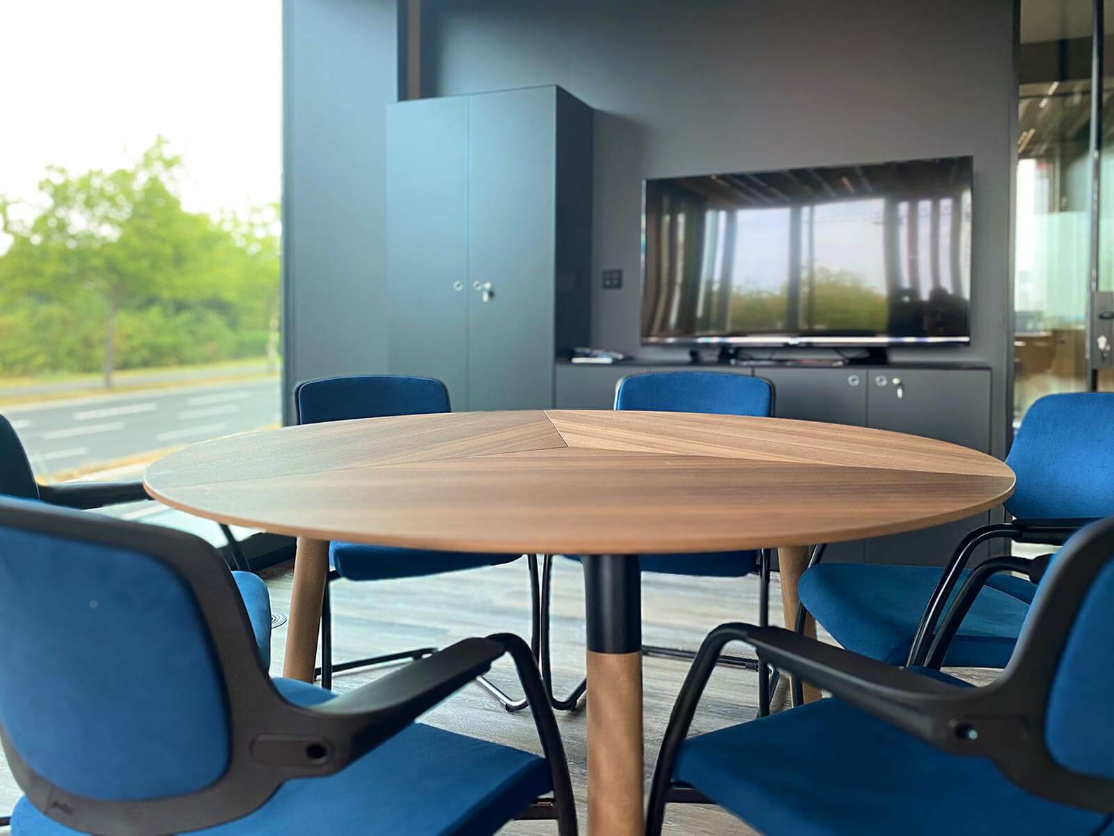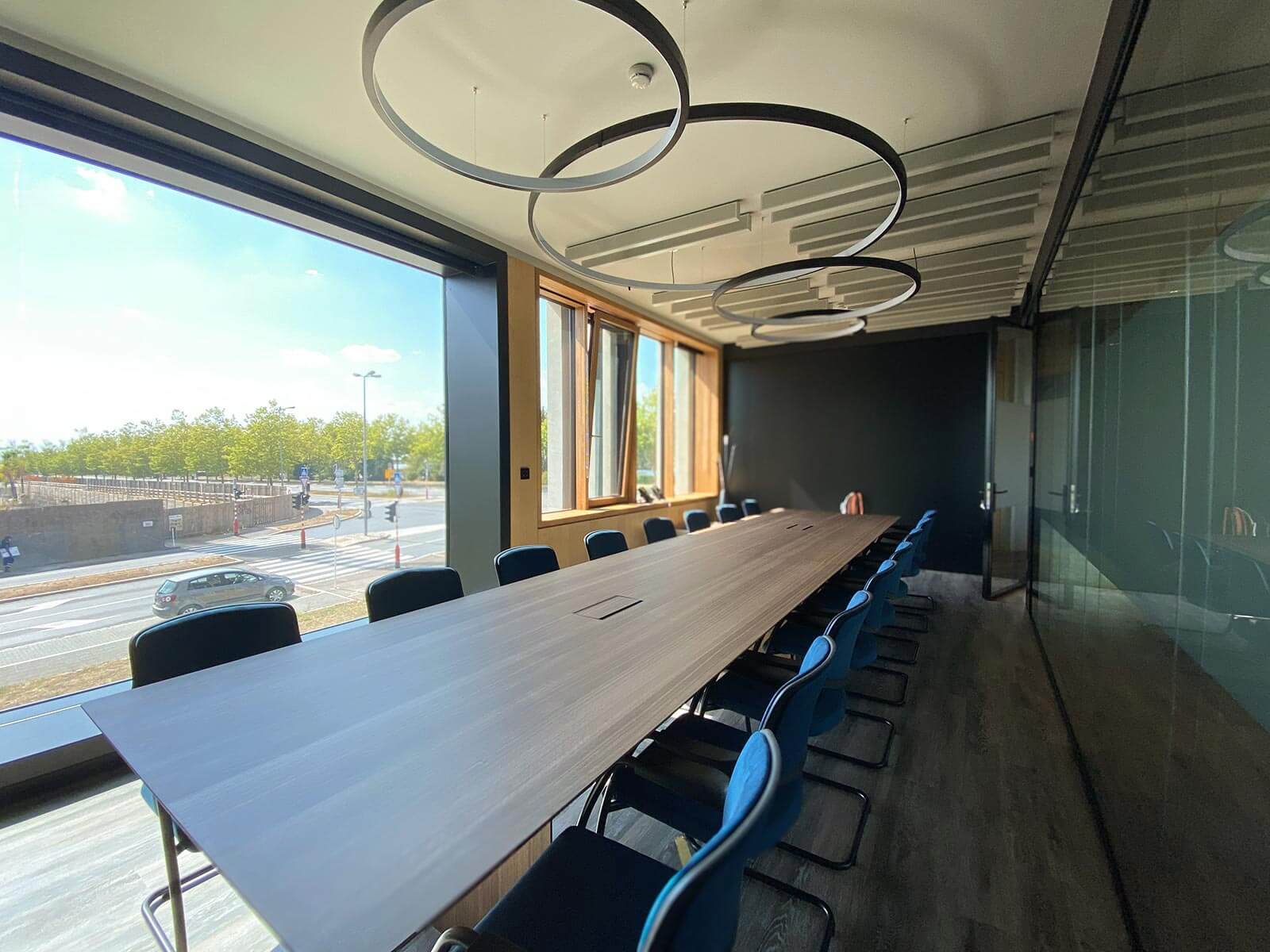 La salle de réunion, pour une entreprise de taille moyenne, est un lieu essentielle et stratégique. Grâce à des belles surfaces vitrées, la pièce est baignée dans une lumière naturelle du plus bel effet. La longueur de la pièce lui confère une belle impression de grandeur. Le mobilier (table et chaises) de qualité premium a été choisi avec le client parmi notre large choix de catalogue de fabricants de bureaux professionnels. Les luminaires Wever et Ducret apporte la petite touche design qui va bien.