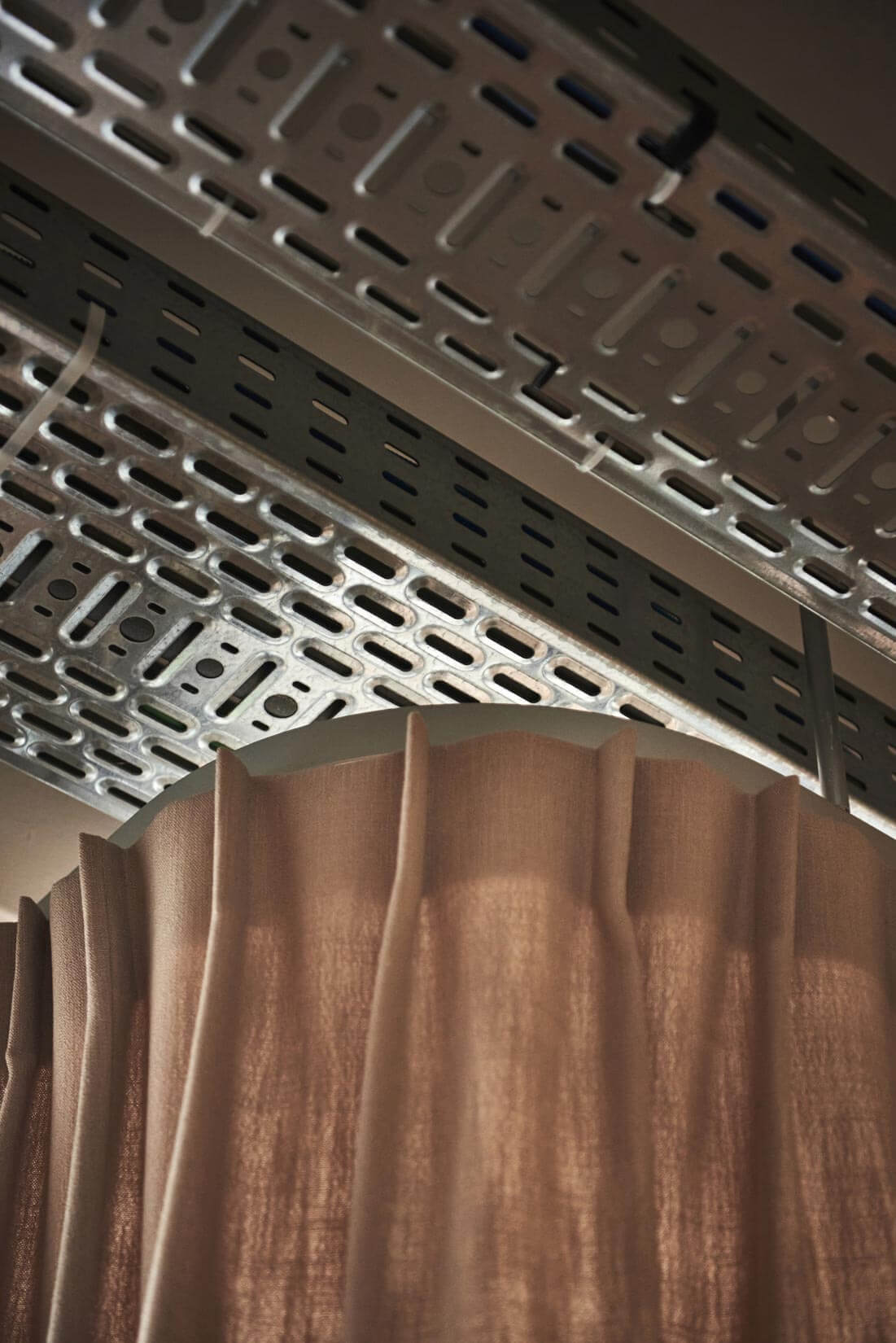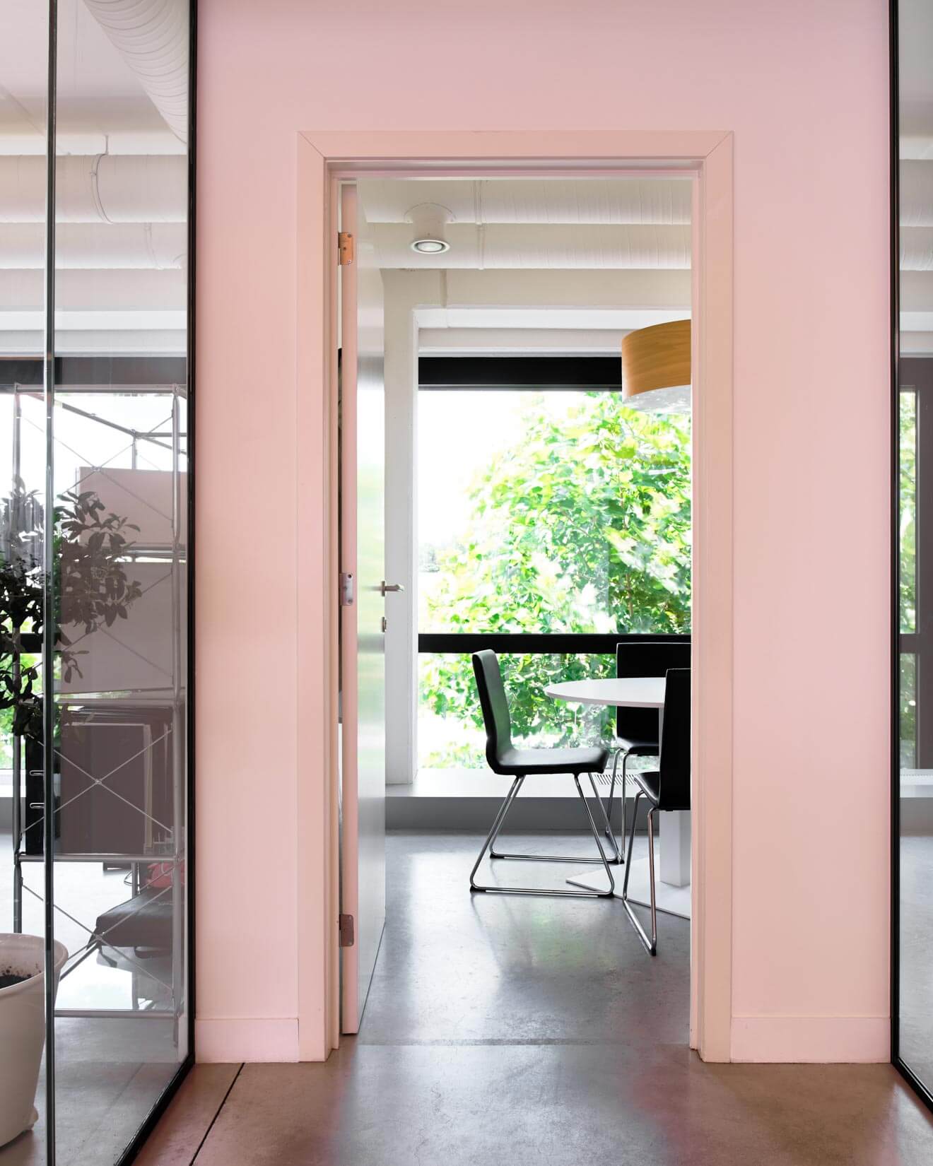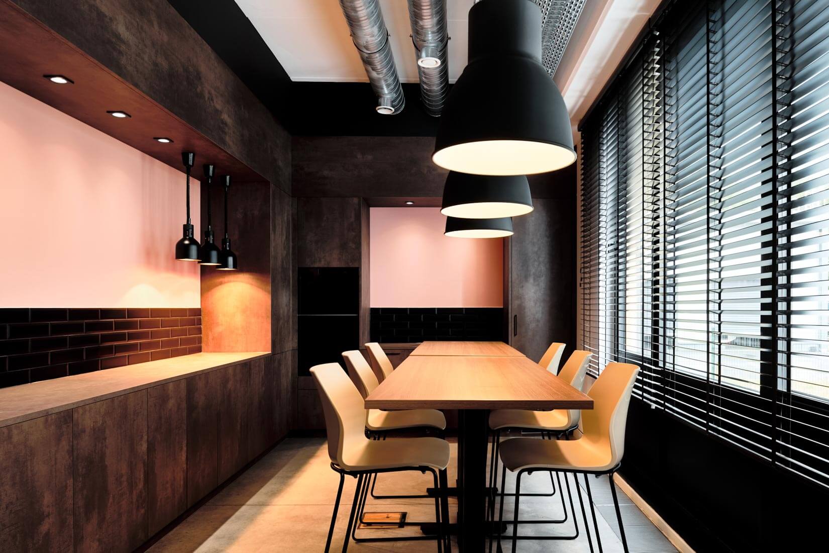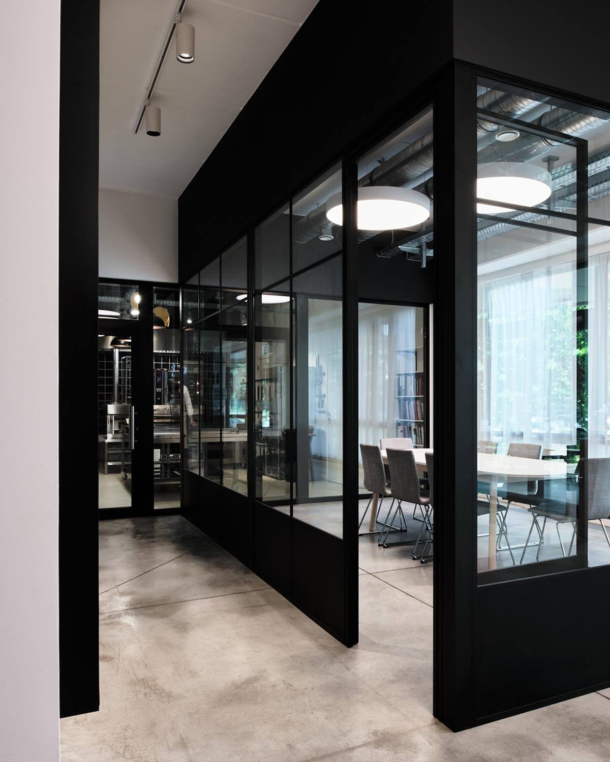 Cloisonner ne signifie pas forcément obstruer ni fermer. Cette salle de réunion s’affiche en toute transparence à travers des verrières de type industriel. La structure “atelier” fait écho aux cuisines que l’on peut observer tout au fond. Une belle perspective est créée, nourrie par des marqueurs architecturaux et visuels forts (les huisseries, les conduits d’aération, les luminaires…).