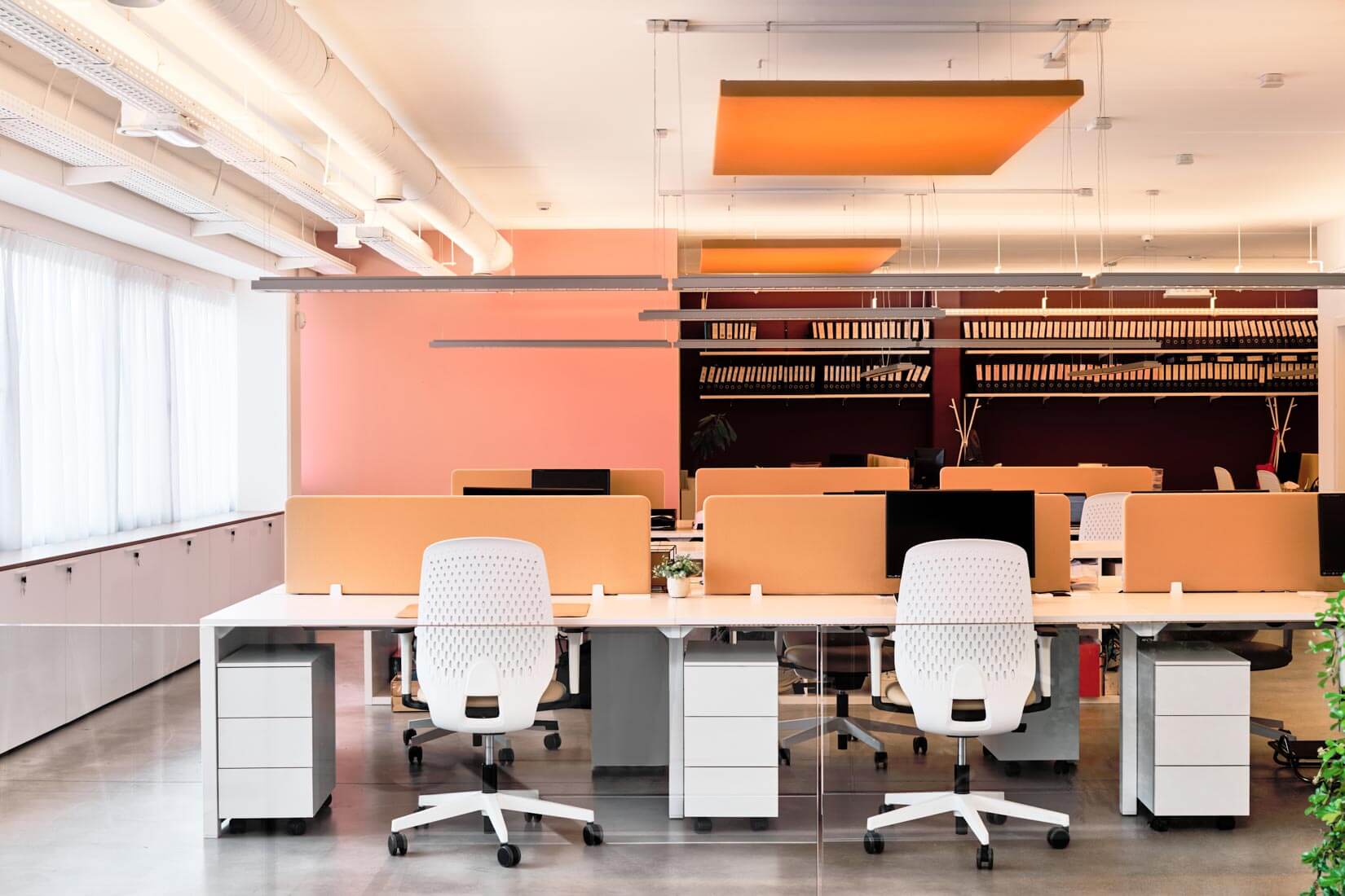Les espaces ont été repensés pour devenir plus ouverts, plus agréables pour le personnel. Du mobilier de qualité a été choisi pour le confort des salariés, que ce soit dans l’open space, les bureaux des cadres, les salles de réunions ou même l’espace cuisine/restauration. Des couleurs pastel apportent de belles touches pop et chaleureuses, allant du rose à l’orangé.
