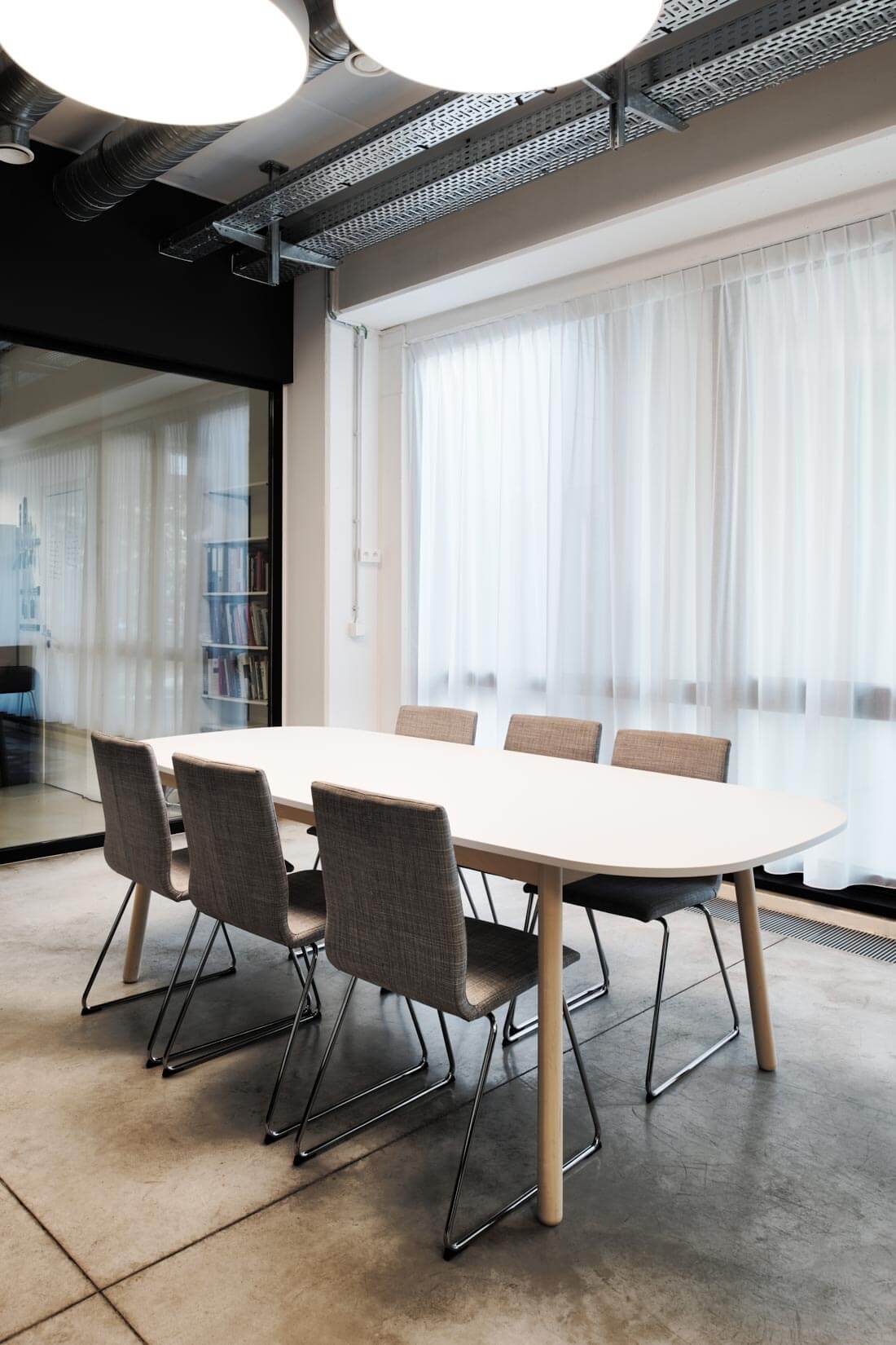 Aménagement d'une salle de réunion avec cloisons vitrées dans les bureaux Tartes Françoise à Nivelles en Belgique par BeHome Interiors Bruxelles