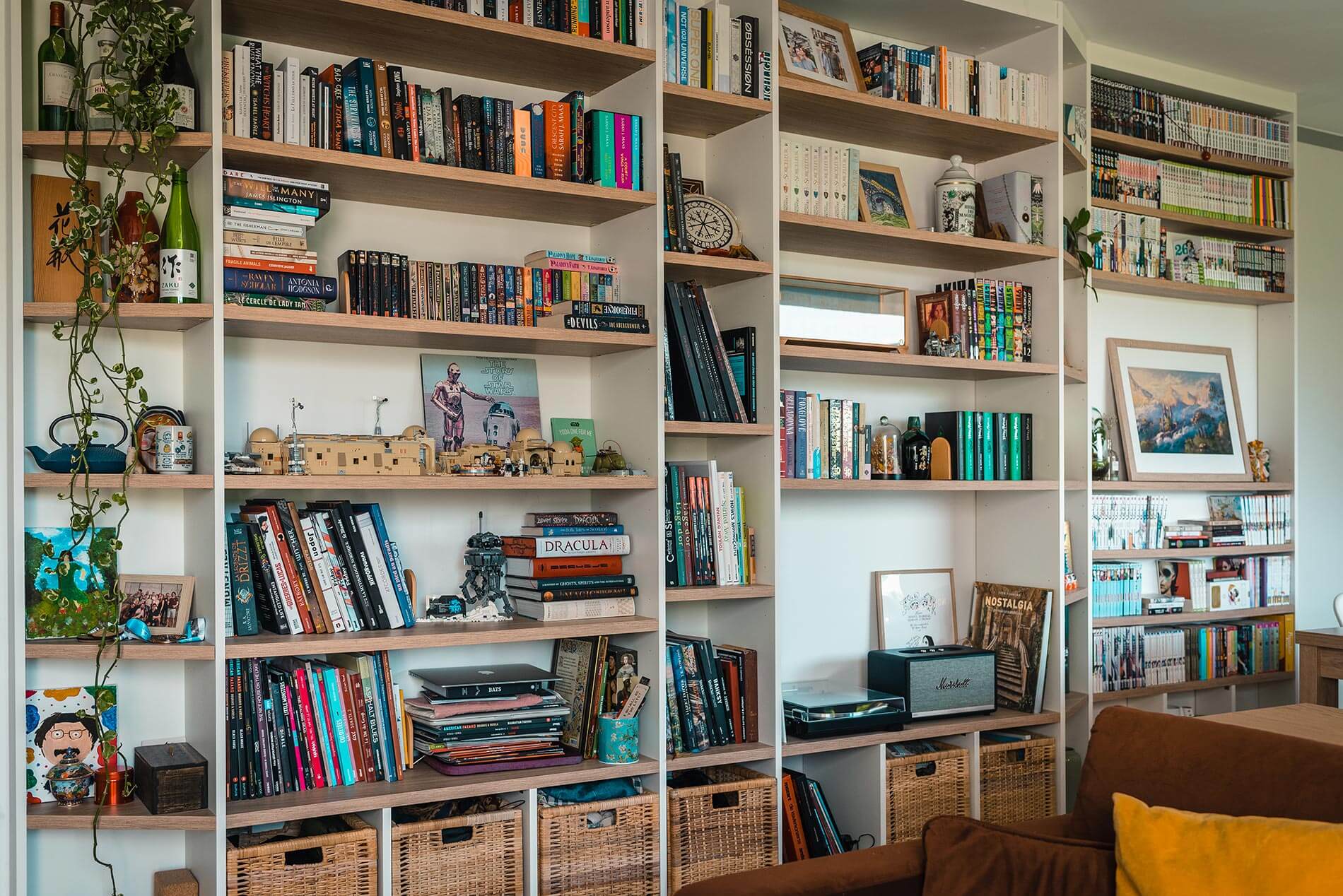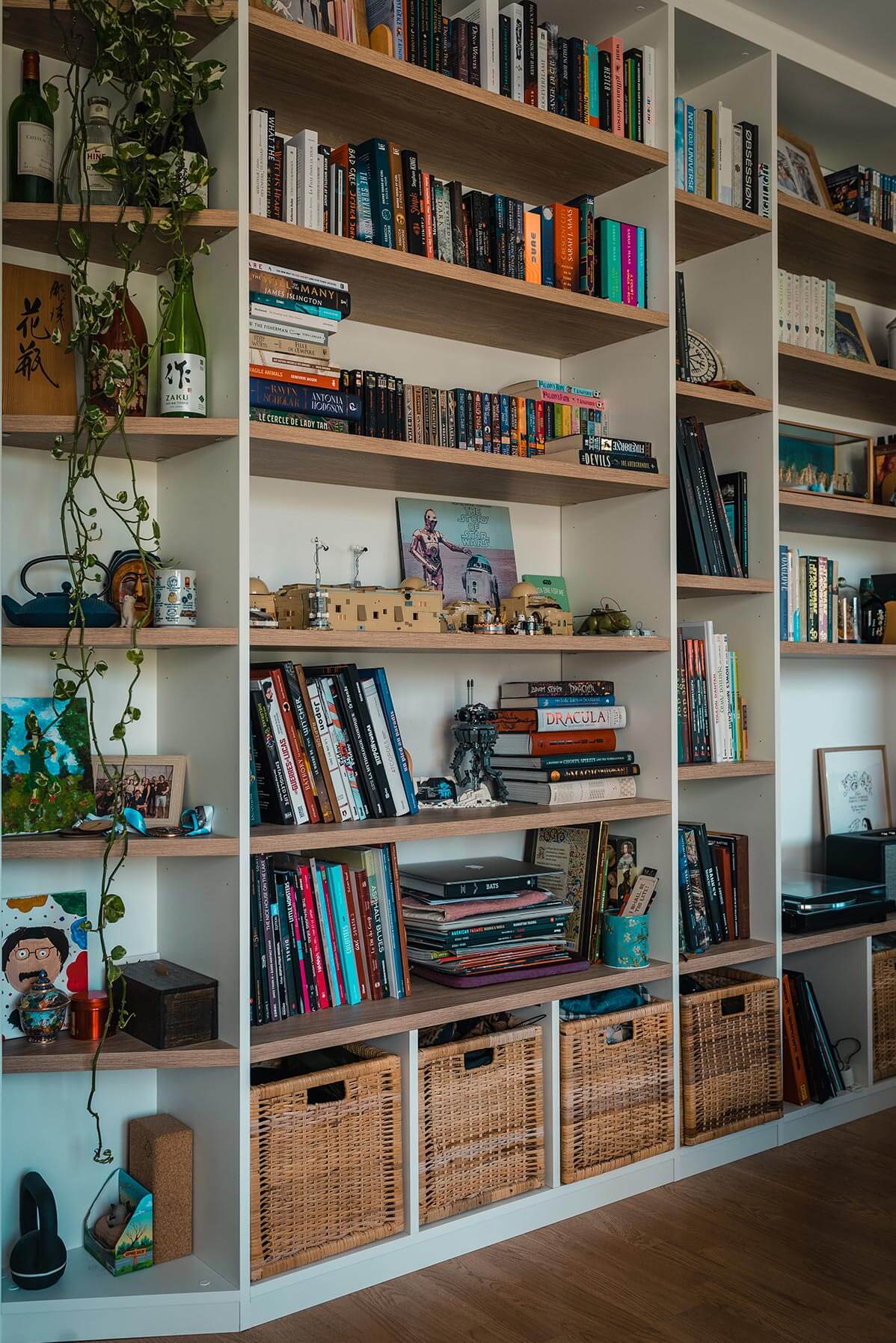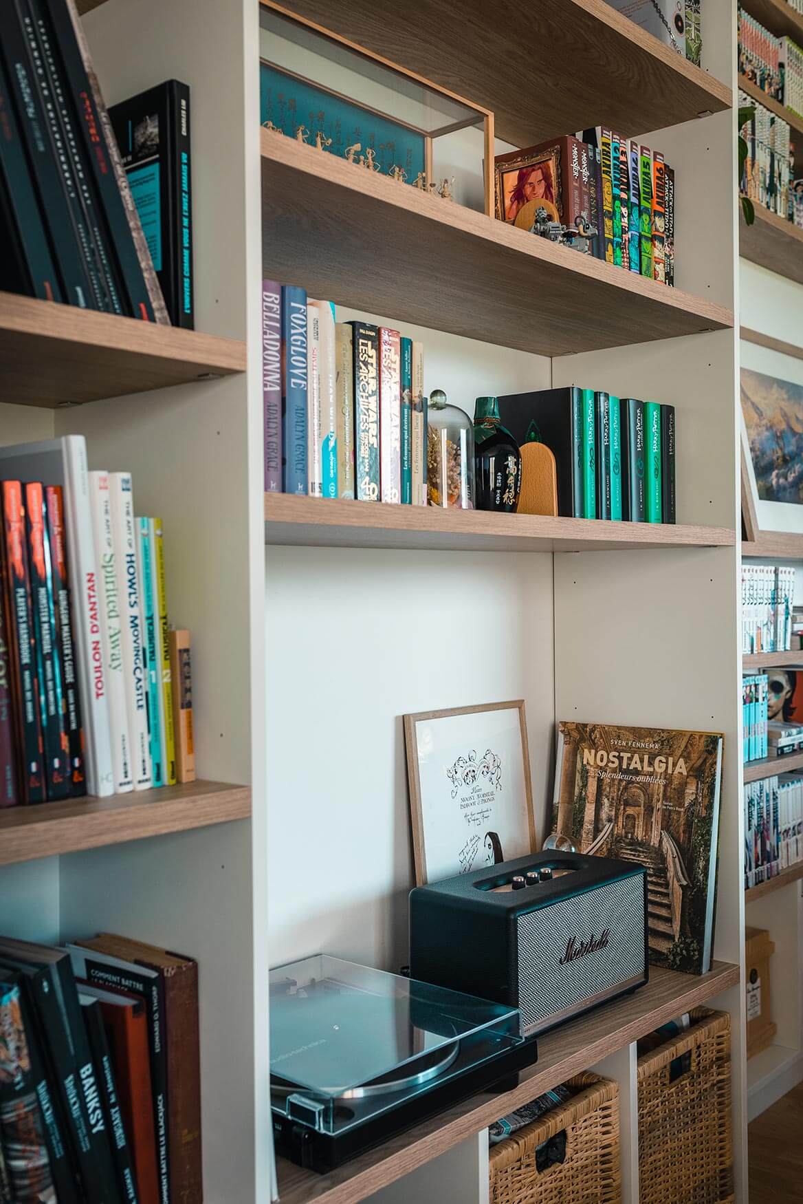 Qui dit meuble sur-mesure dit possibilités multiples, voire infinies pour une bibliothèque. Lorsque les clients nous présentent leurs volontés, ils nous parlent de bandes dessinées traditionnelles, de mangas, de beaux livres, de vinyles (et de leur platine dédiée), des objets, des figurines… Autant de supports physiques de tailles différentes. Nous leur proposons d’adapter le meuble à leurs collections, en créant un jeu de profondeur sur les étagères. Et d’étendre le meuble au maximum entre deux portes et sur toute la hauteur du mur. Bingo !
