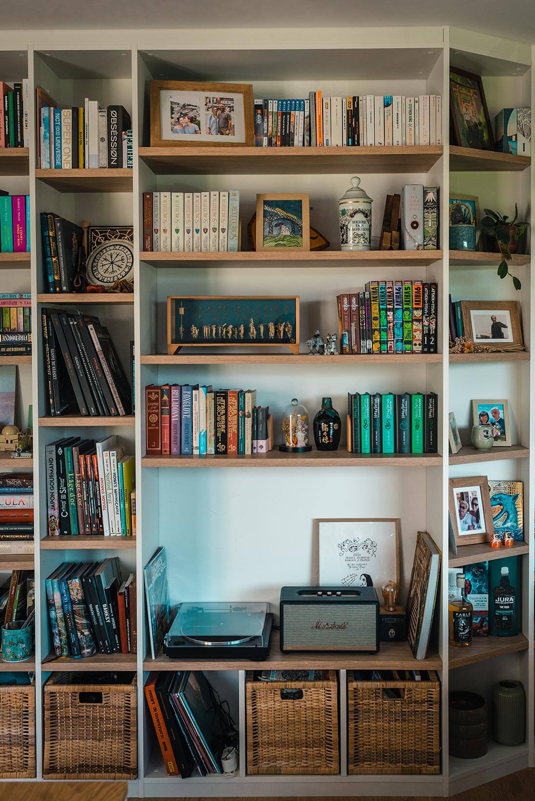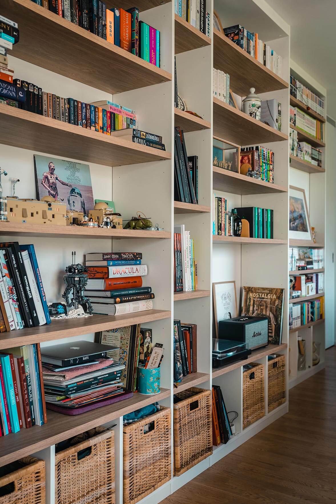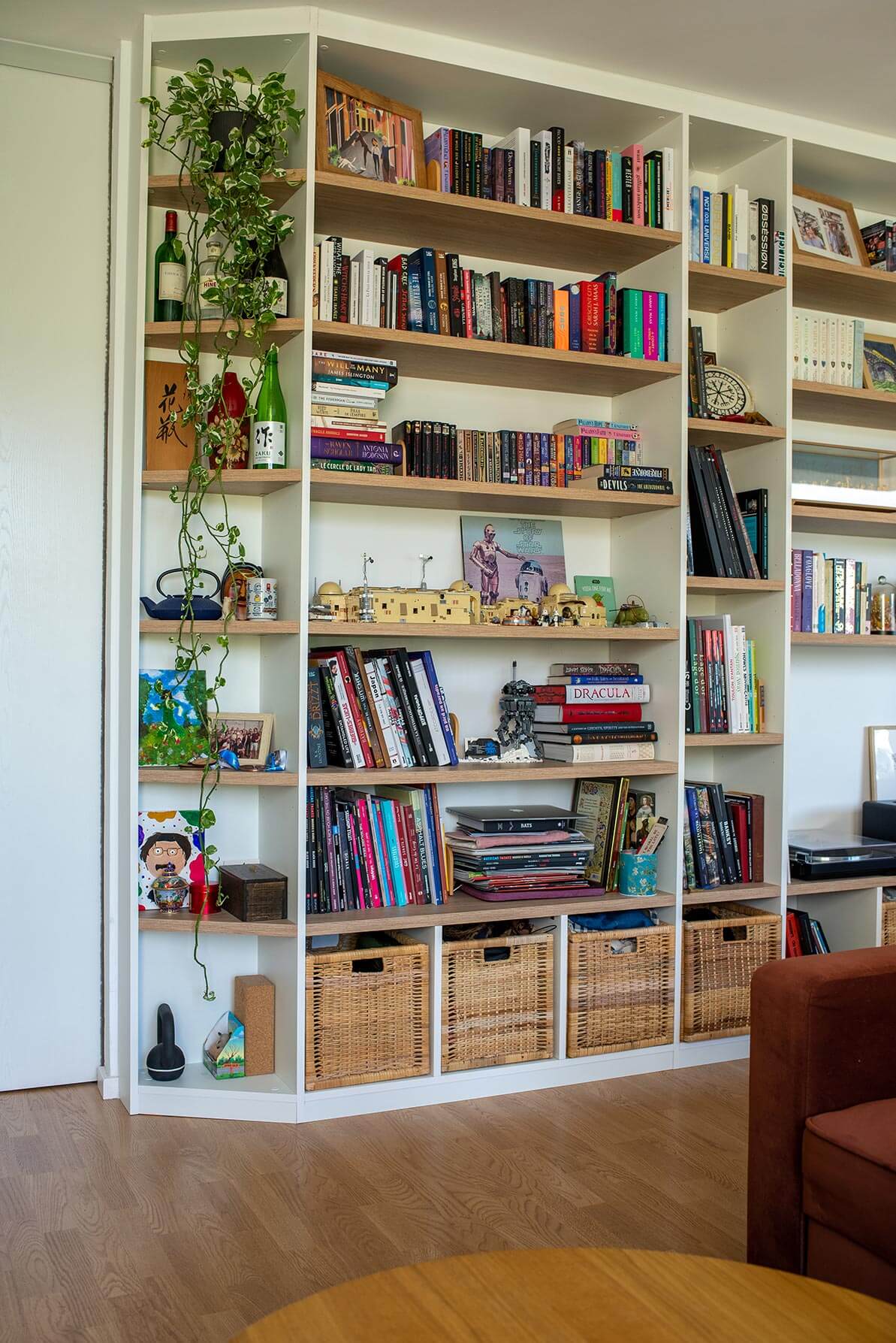 Qui dit meuble sur-mesure dit possibilités multiples, voire infinies pour une bibliothèque. Lorsque les clients nous présentent leurs volontés, ils nous parlent de bandes dessinées traditionnelles, de mangas, de beaux livres, de vinyles (et de leur platine dédiée), des objets, des figurines… Autant de supports physiques de tailles différentes. Nous leur proposons d’adapter le meuble à leurs collections, en créant un jeu de profondeur sur les étagères. Et d’étendre le meuble au maximum entre deux portes et sur toute la hauteur du mur. Bingo !