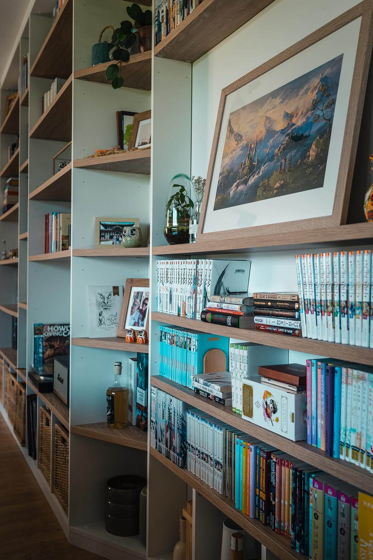 Une des originalités de ce meuble est la différence de profondeur entre la partie gauche et la droite, où sont placés les mangas, de taille assez standardisée. Ainsi les tranches des ouvrages sont bien alignés avec celle de l’étagère sur laquelle ils sont posés. Un angle subtil les lie pour créer une belle continuité tout en douceur. Un angle qu’on retrouve à l’extrémité gauche du meuble, et qui finit le meuble de manière douce.