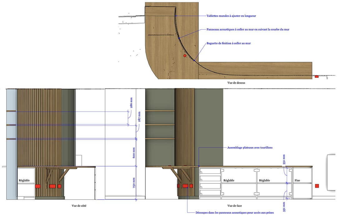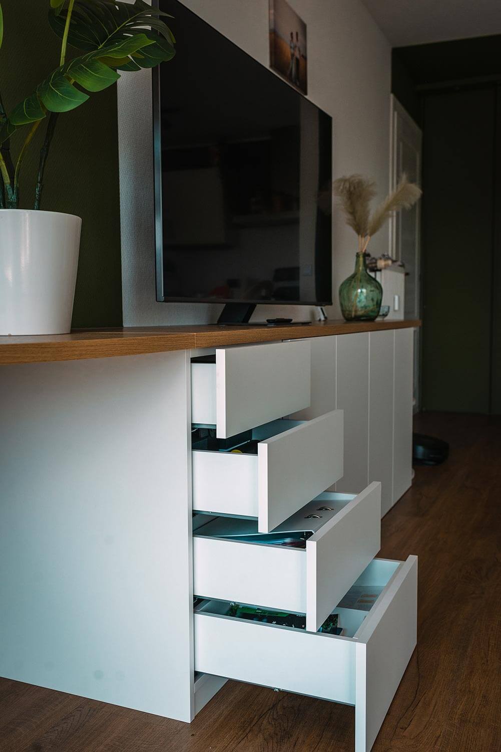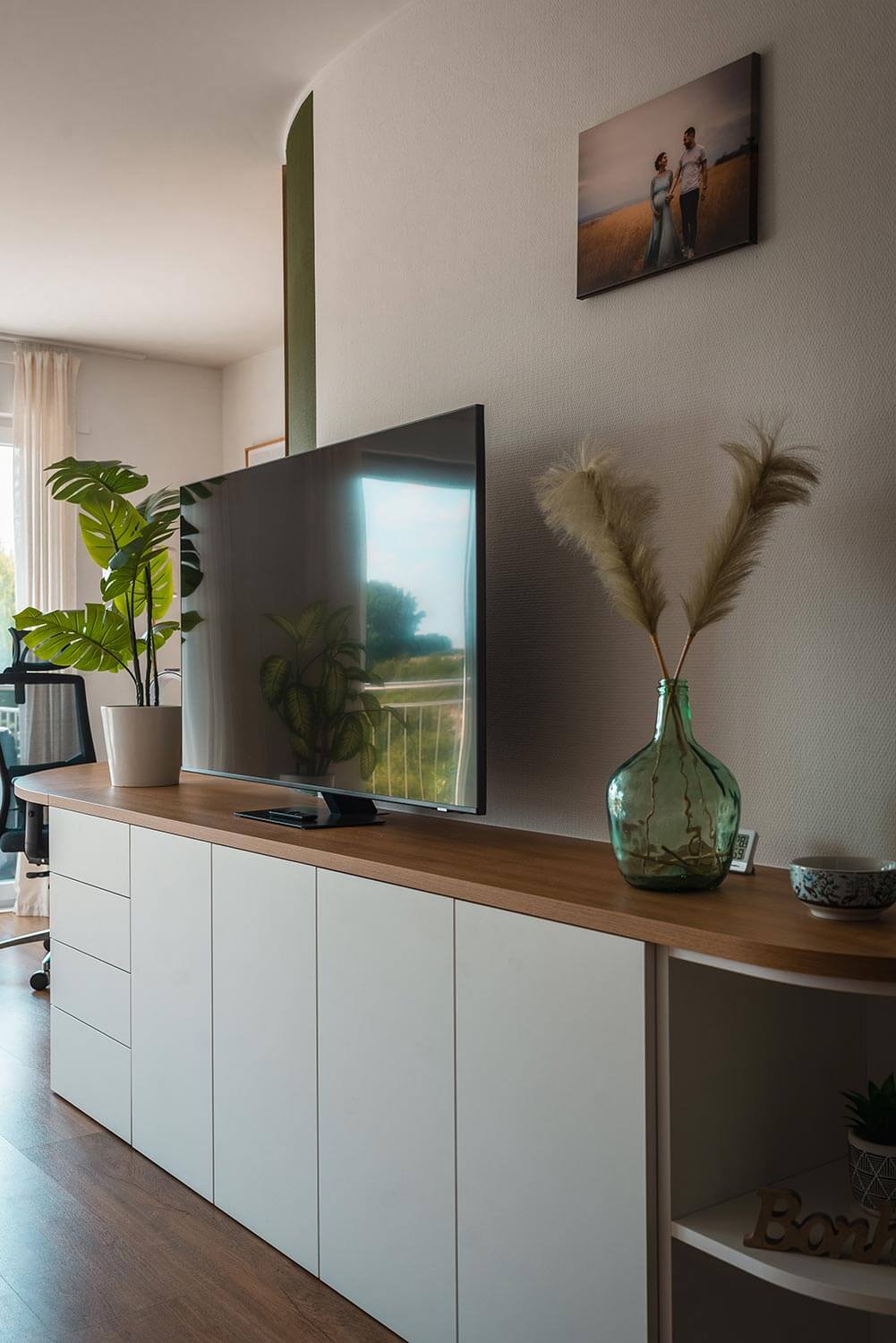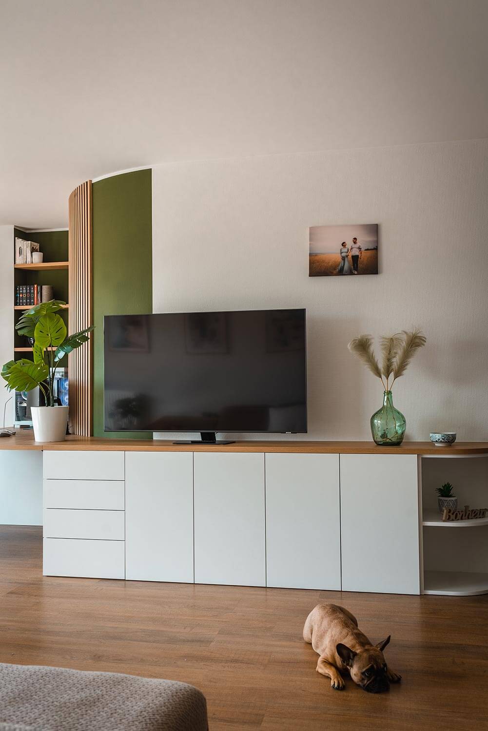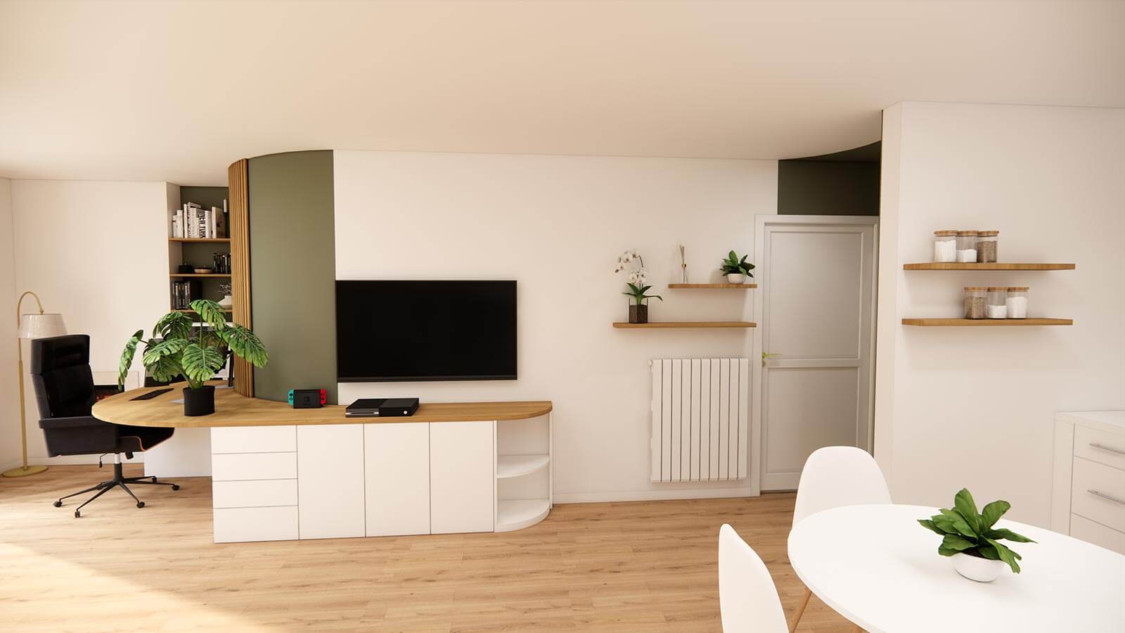 Dans cet appartement bien ordonné, un couple y vit avec leur petite fille et un joli chien. La pièce principale est une vraie pièce à vivre car la cuisine est attenante au salon, dans lequel un bureau a également pris place. La télévision est posée le long du mur sur un meuble bas commun qu’on voit souvent dans des logements. Un bureau le prolonge dans l’angle. Sauf que cet « angle » est arrondi! Cela crée une perte de place, et quand on en manque, c’est bien dommage. Le couple imaginait pouvoir gagner une pièce, mais créer une cloison aurait engendré une perte de lumière. L’idée d’exploiter cet arrondi, lorsque l’on conçoit des meubles sur mesure, nous vient comme une évidence.