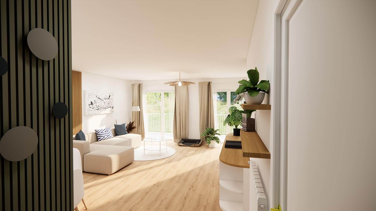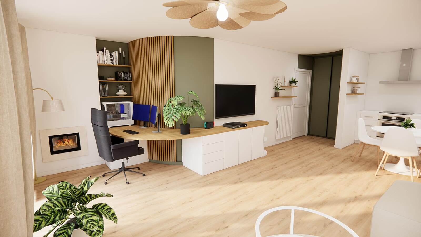 «Notre pièce à vivre avait un potentiel mais nous ne savions pas comment faire pour la rendre plus agréable et fonctionnelle. BeHome Interiors nous a proposé démontrer l’arrondi du mur principal et a imaginé un meuble bureau prolongé par des rangements. Ils nous ont concocté une petite beauté et avec l’association des couleurs, notre pièce a vraiment gagné en qualité de vie.»