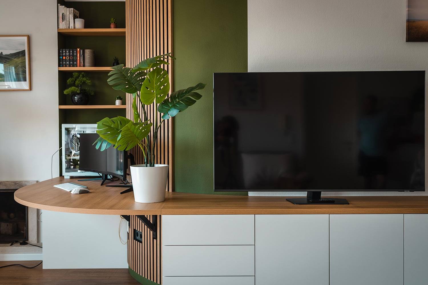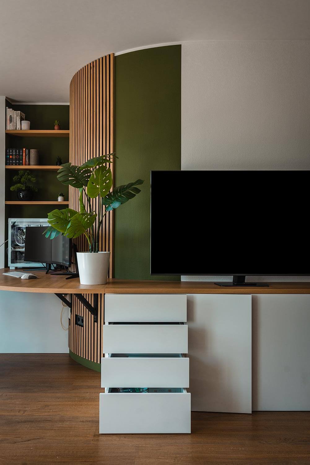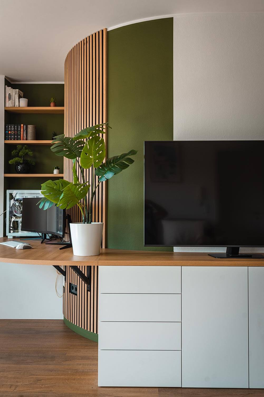Un mur arrondi est finalement assez rare dans un logement contemporain, à Peppange ou ailleurs. Certes, créer un bureau sur mesure avec cette contrainte architecturale n’est pas de tout repos, mais lorsqu’on fait du sur-mesure, c’est une occasion rêvée pour démontrer son savoir-faire, au service de clients en attente d’idées originales. La combinaison de l’arrondi pour le bureau, prolongé par le meuble bas qui permettra d’y replacer la TV, ainsi que la peinture verte souhaitée par le client, les lattes de bois et quelques étagères, donnent un résultat très élégant et ajoutent une forte personnalité à la pièce.