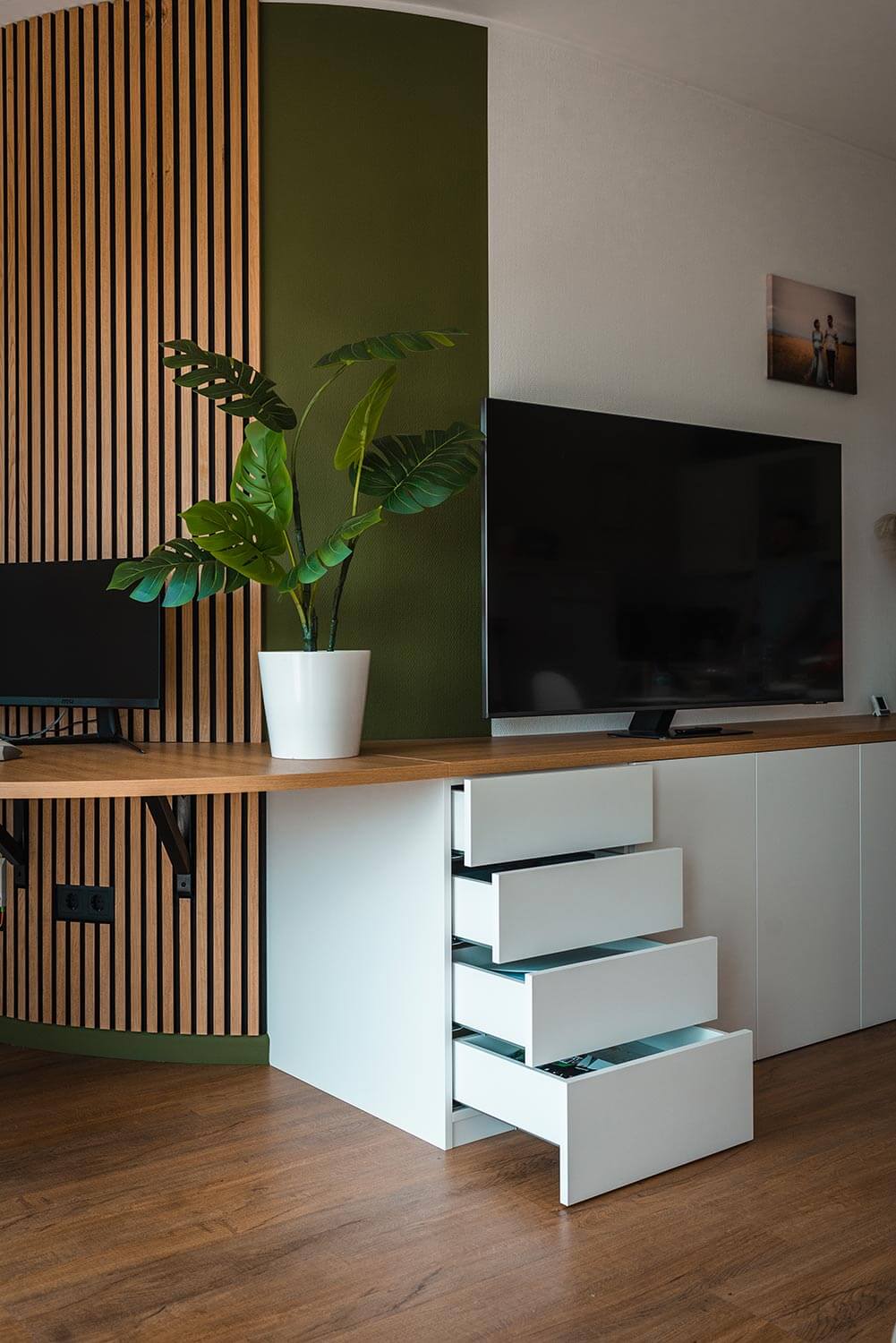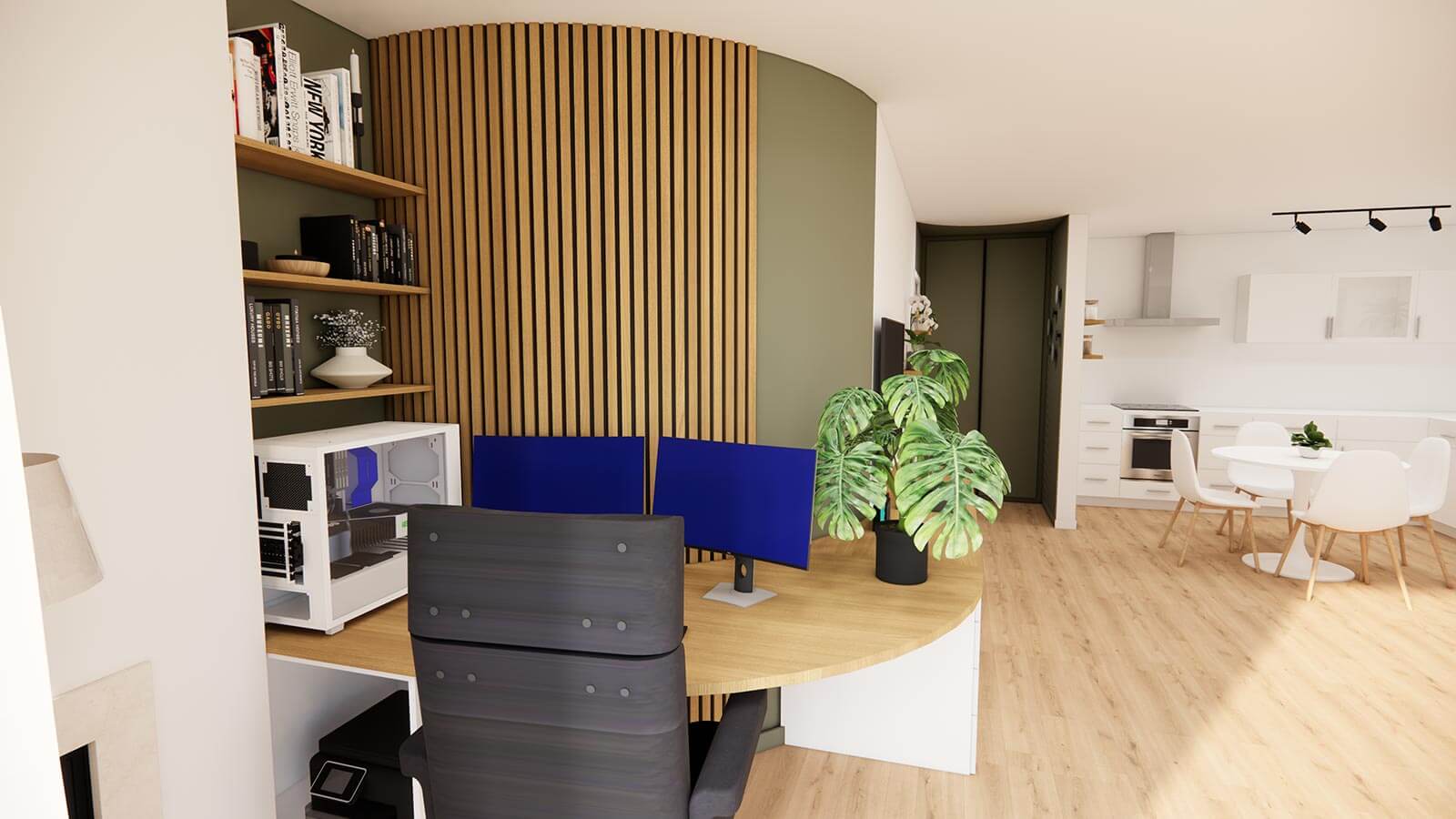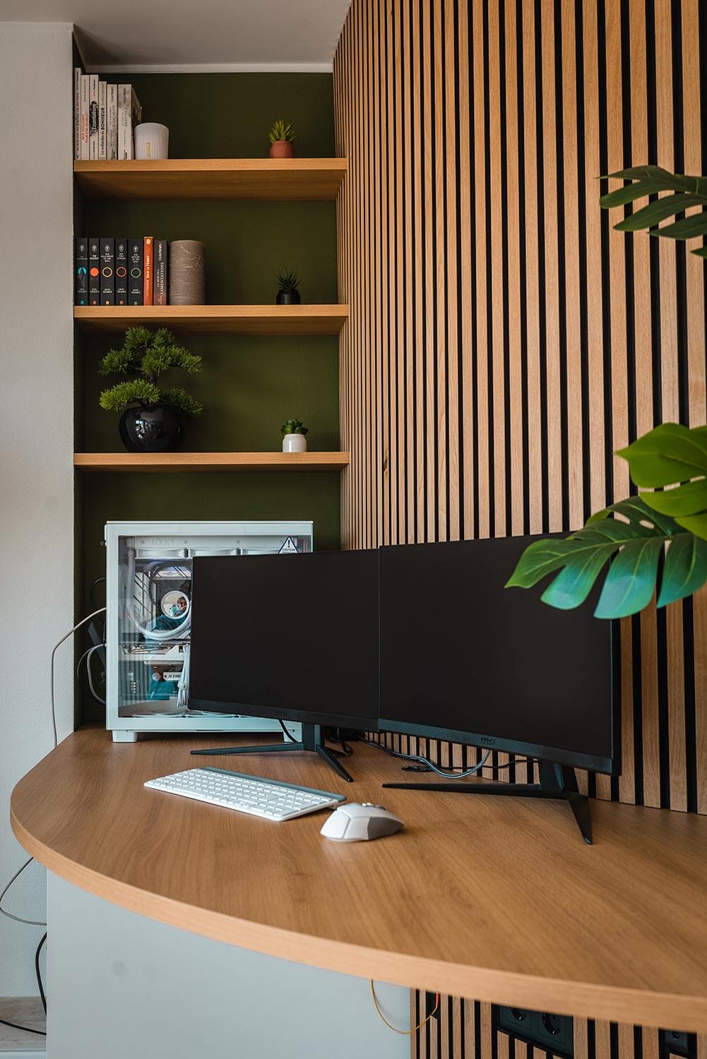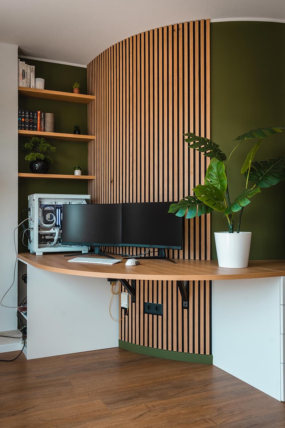 Un mur arrondi est finalement assez rare dans un logement contemporain, à Peppange ou ailleurs. Certes, créer un bureau sur mesure avec cette contrainte architecturale n’est pas de tout repos, mais lorsqu’on fait du sur-mesure, c’est une occasion rêvée pour démontrer son savoir-faire, au service de clients en attente d’idées originales. La combinaison de l’arrondi pour le bureau, prolongé par le meuble bas qui permettra d’y replacer la TV, ainsi que la peinture verte souhaitée par le client, les lattes de bois et quelques étagères, donnent un résultat très élégant et ajoutent une forte personnalité à la pièce.