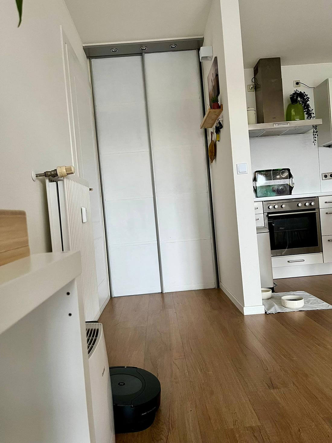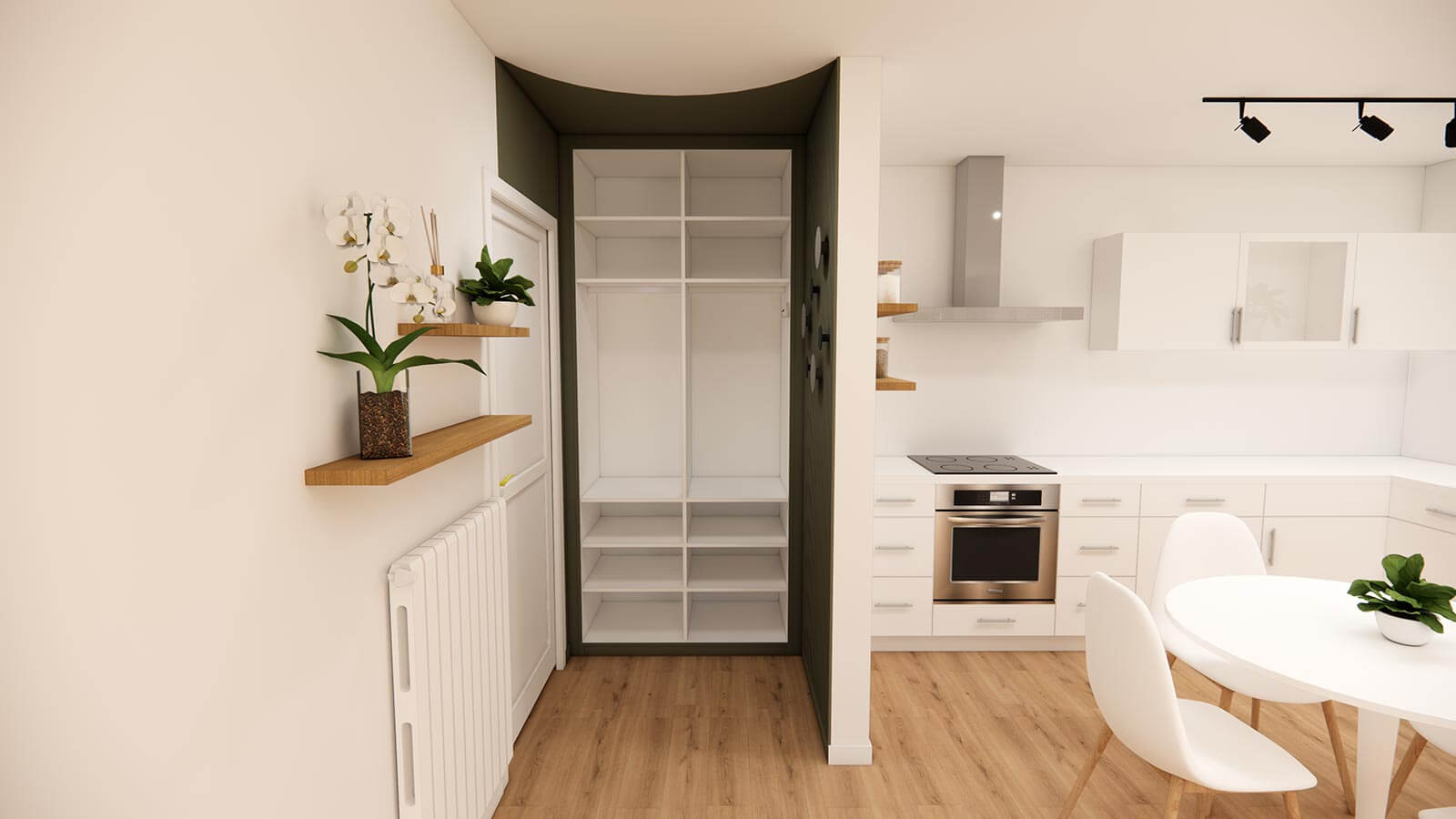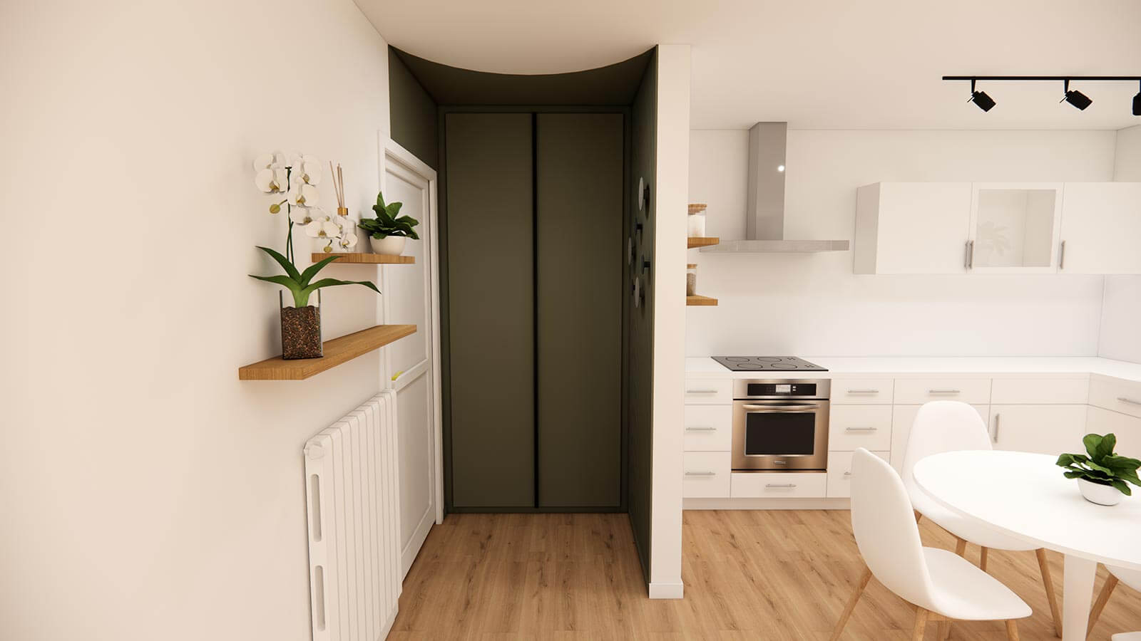 La grande pièce de 30 m2 de cet appartement fait depuis toujours office de cuisine, salon, salle à manger et bureau. Un tout-en-un nécessaire lorsqu’on possède un logement de surface moyenne qu’il s’agit d’optimiser, d’autant plus qu’un mur arrondi ne facilite pas l’aménagement. Lorsque nous rencontrons le client dans le petit village de Peppange près de Esch-sur-Alzette, ce couple parent d’une petite fille nous questionne rapidement sur les possibilités d’optimiser cette pièce à vivre.