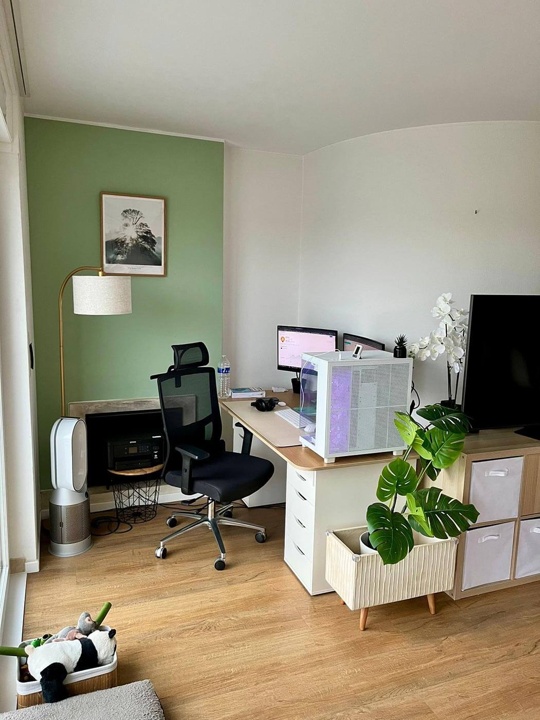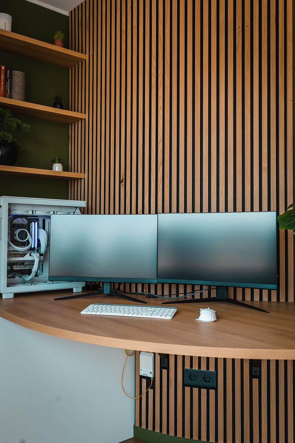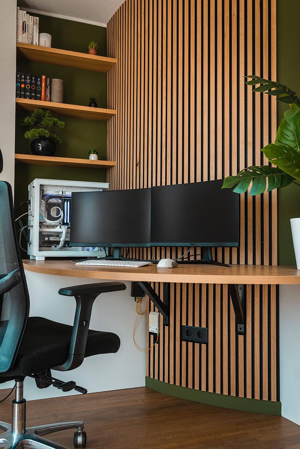 Le plateau du bureau en mélaniné Oak Lancashier apporte une touche horizontale chaleureuse à la pièce. Le lattage mural, tout en bandes verticales boisées posées sur un fond vert olive, ajoute encore une patine naturelle pour ces amoureux de la flore.
