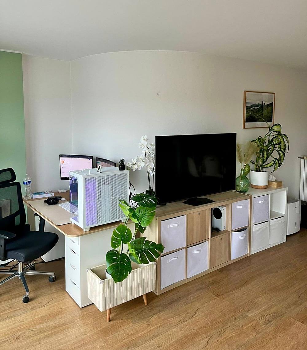 Les portes et tiroirs du meuble bas sont dénués de poignées, une simple poussée permettant de les ouvrir. Les documents et affaires diverses trouvent leur place dans ces placards aux volumes généreux.