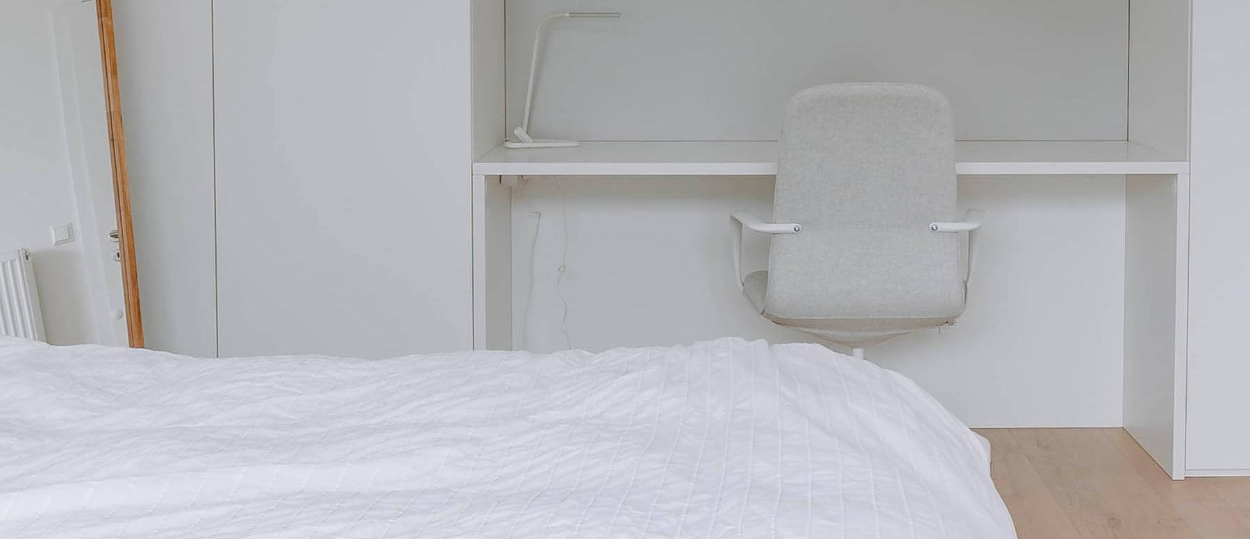 Dans cette chambre assez classique, où le blanc était déjà bien présent sur les murs, la literie, le plafond, notre client à Dudelange a souhaité pousser le concept de blancheur encore plus loin, pour donner à cette pièce un cachet particulier que ne renierait pas Stanley Kubrick. En confiant ce projet d’aménagement de bureau sur mesure à BeHome Interiors Luxembourg, le client s’est laissé séduire par notre idée de meuble « total », qui combine bureau, bibliothèque et dressing. Le blanc est désormais devenu roi, fauteuil inclus…