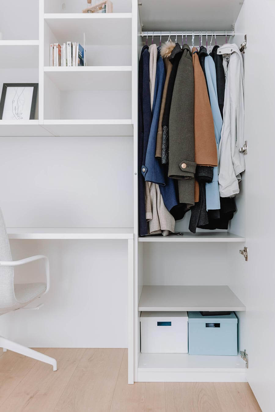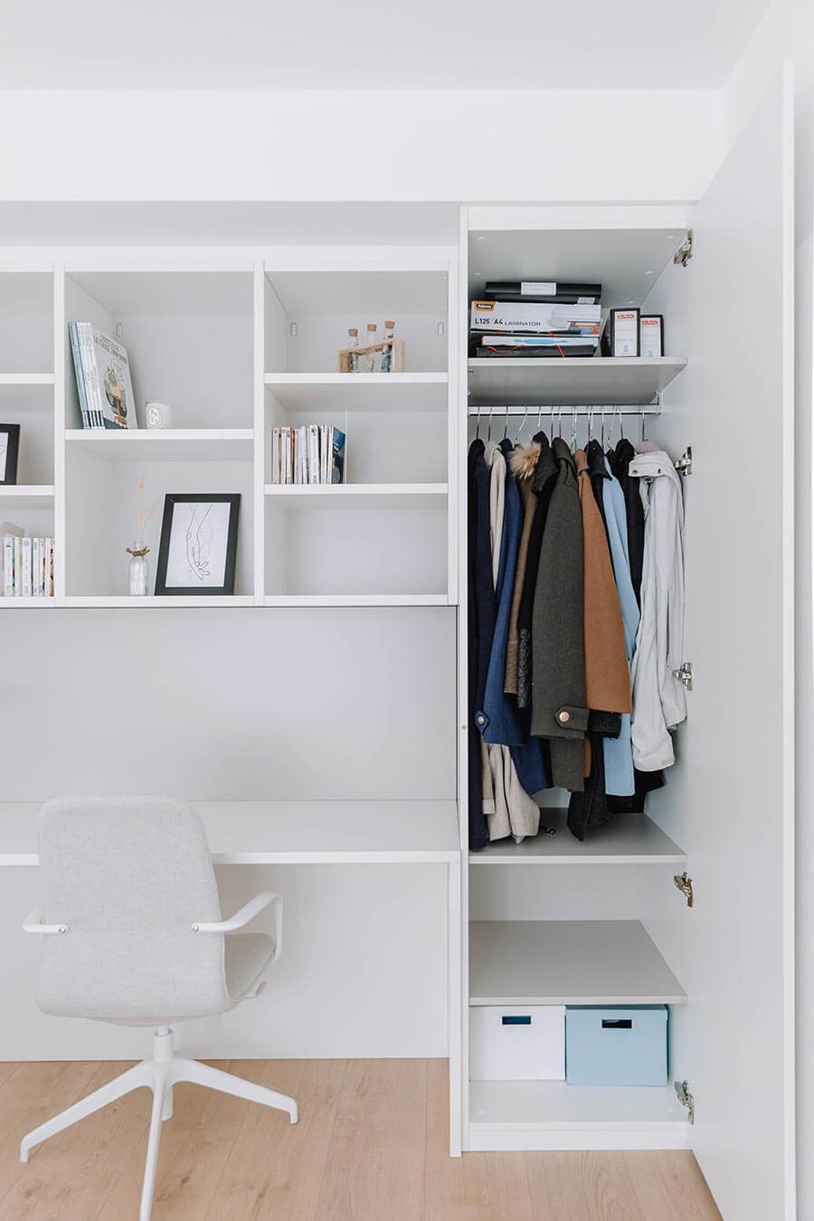 De part et d’autre du bureau, pièce centrale de ce meuble sur mesure, des portes sans poignées, qui s’ouvre d’une simple pression. Derrière elle se cachent plusieurs espaces de rangement qui servent de dressing, vestiaire et placard. Rien ne traîne, chaque chose trouve sa place dans ce bureau à Dudelange.