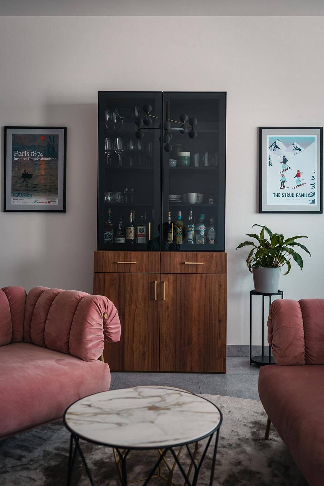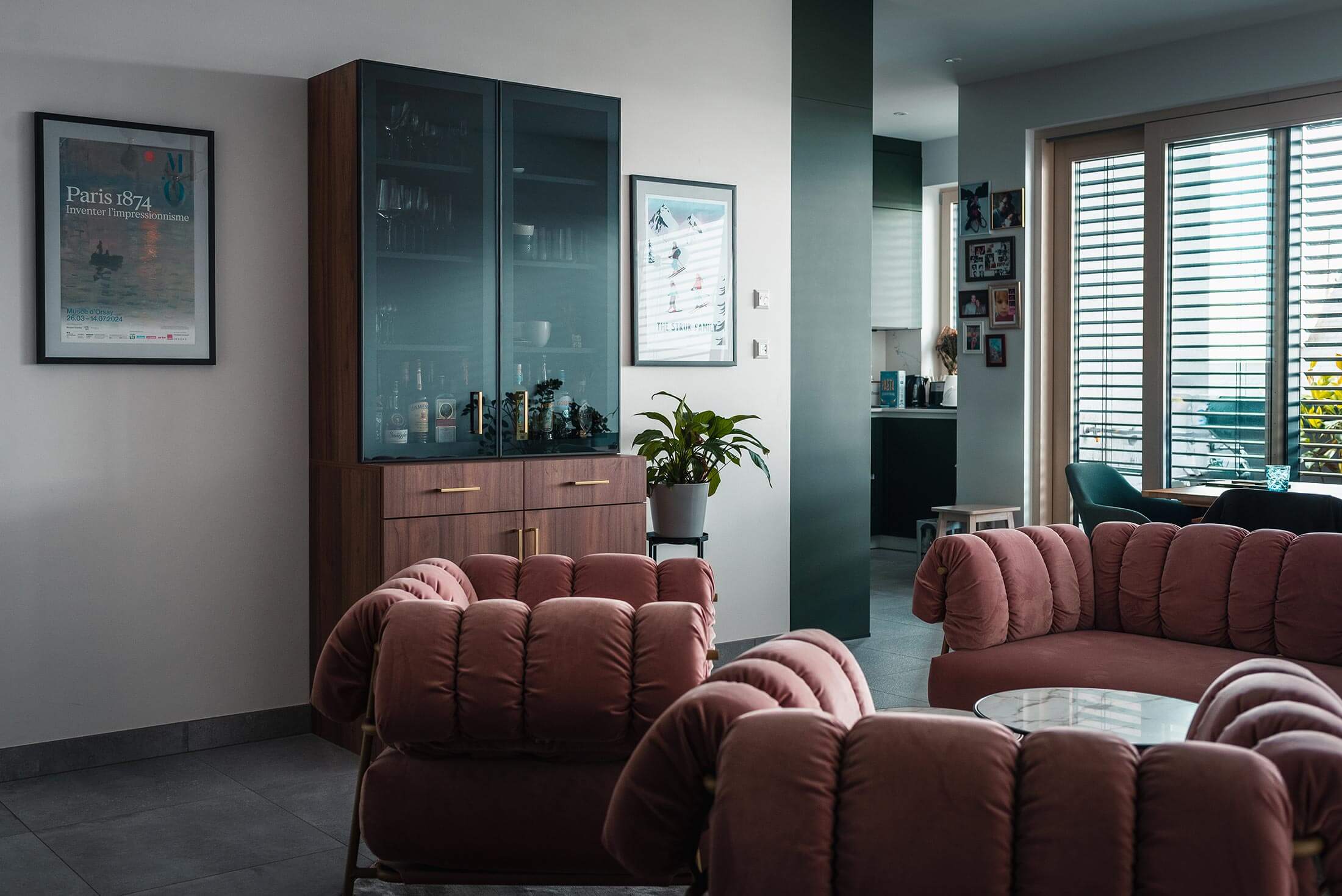 Aménagement intérieur de salon à Hespérange au Luxembourg - Meuble buffet sur mesure et fauteuil