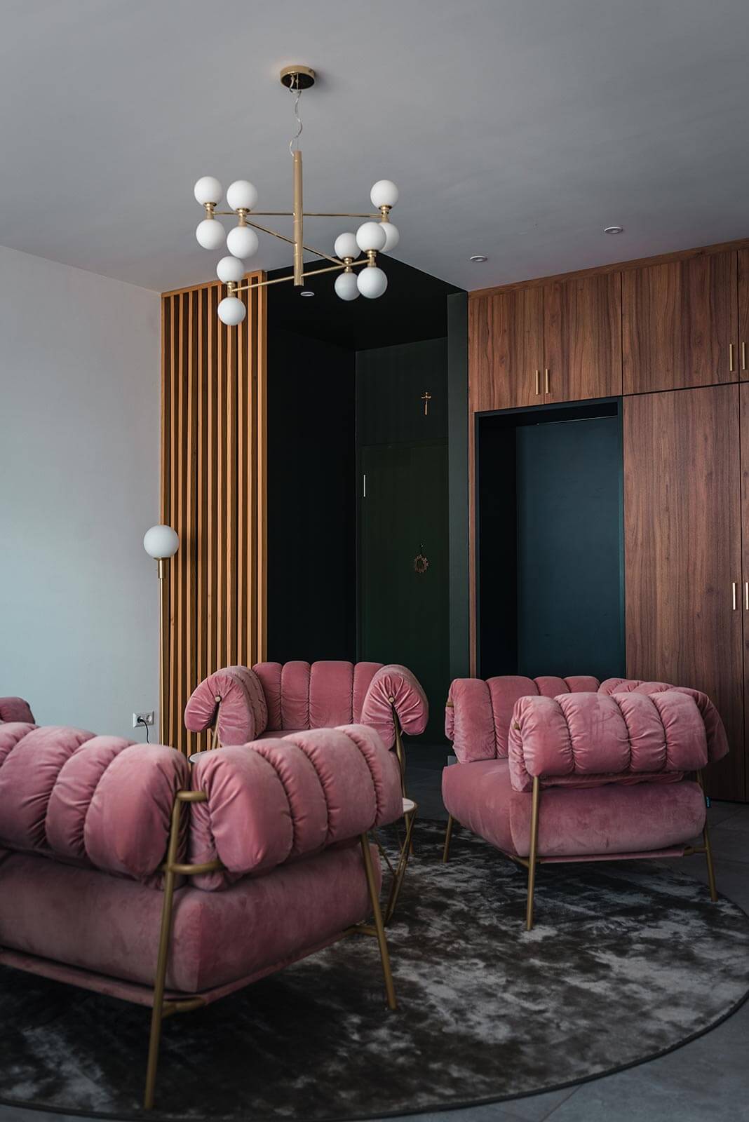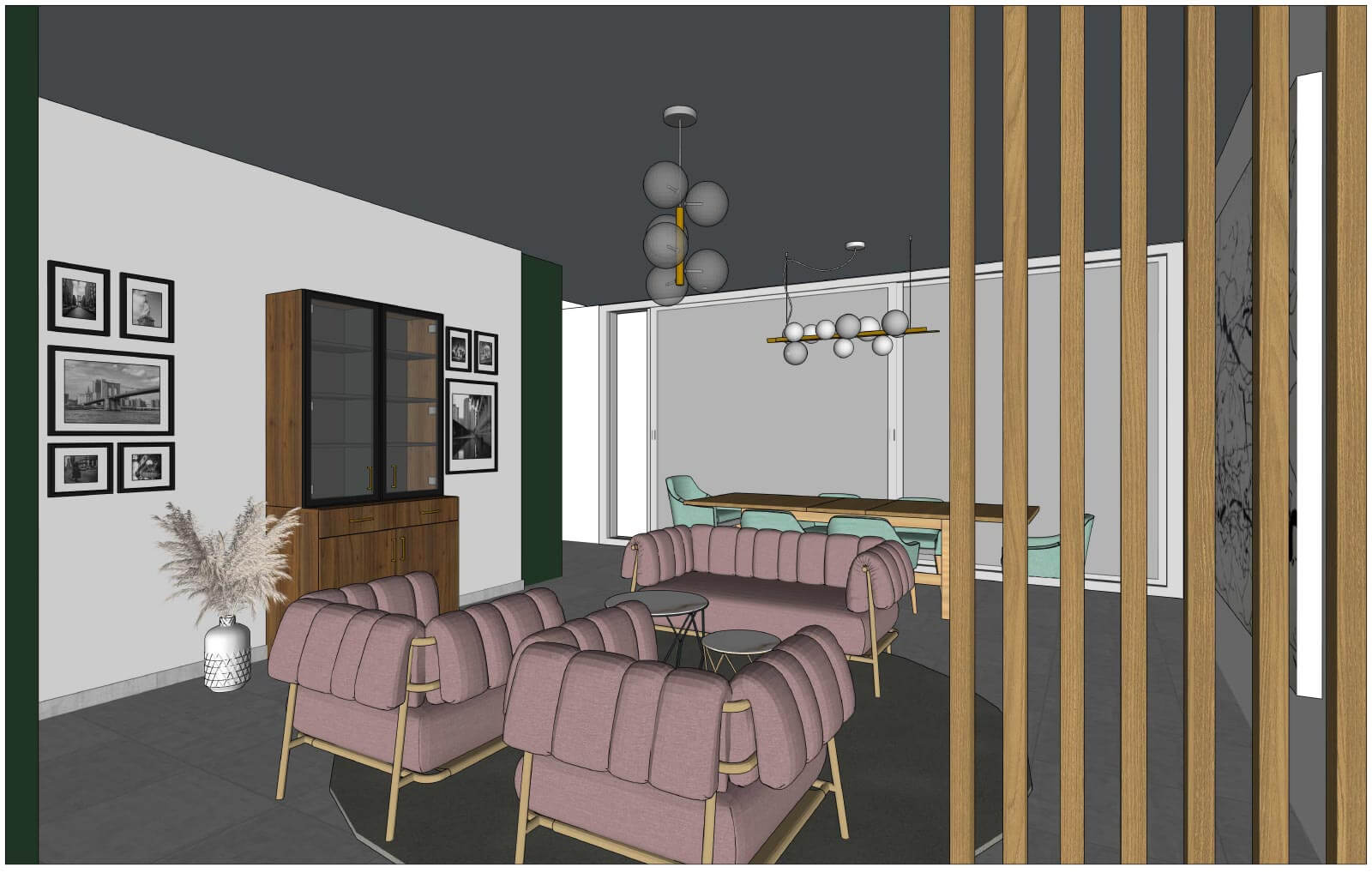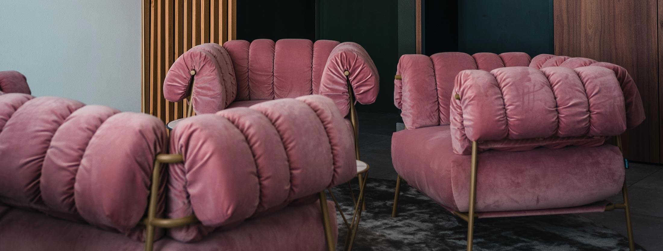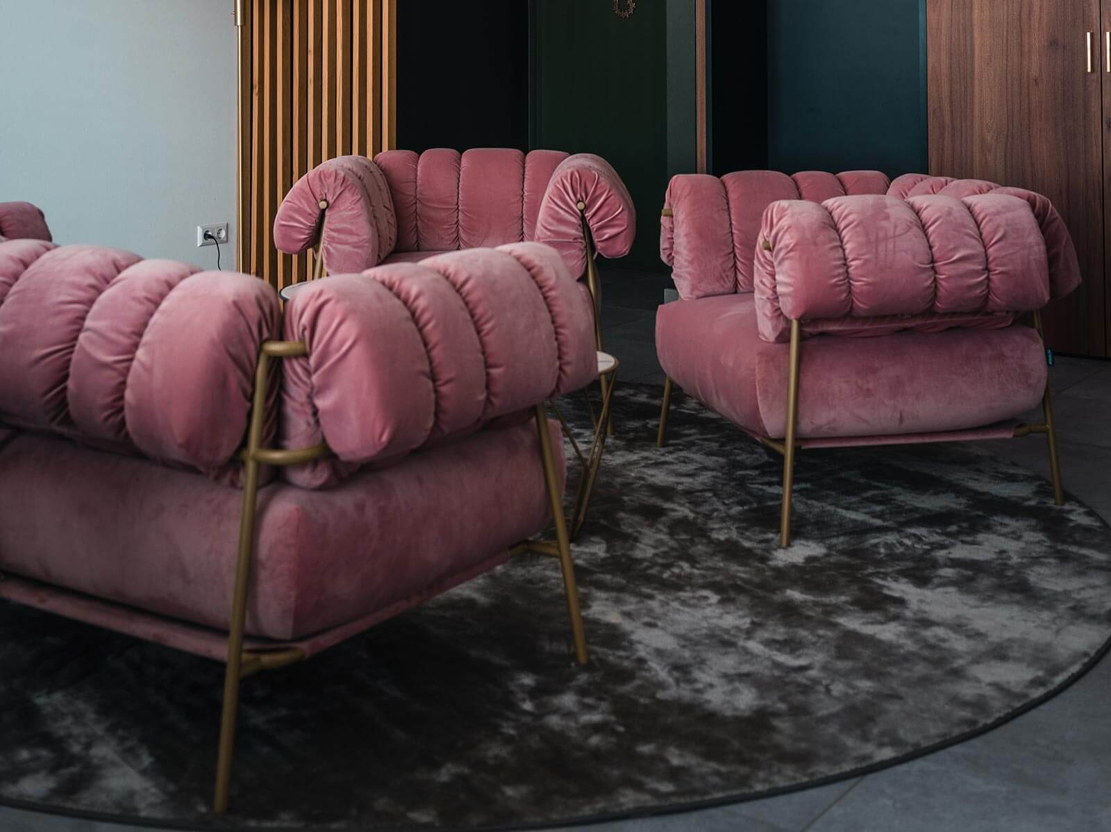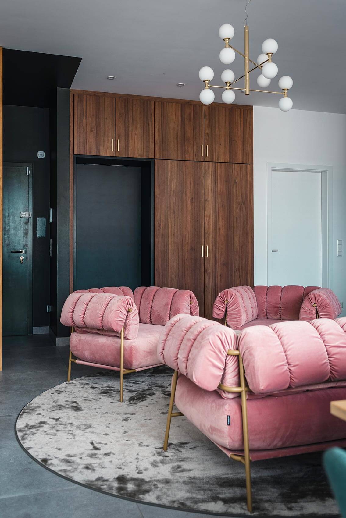Le blanc, le bois, le noir dominants la pièce, faut-il rester dans cette harmonie ou la briser? Notre choix a été de proposer d’introduire une couleur audacieuse à travers les fauteuils Bonaldo. Une touche de rose élégant qui crée visuellement une zone centrale, rehaussée par un grand tapis Club et des tables basses.