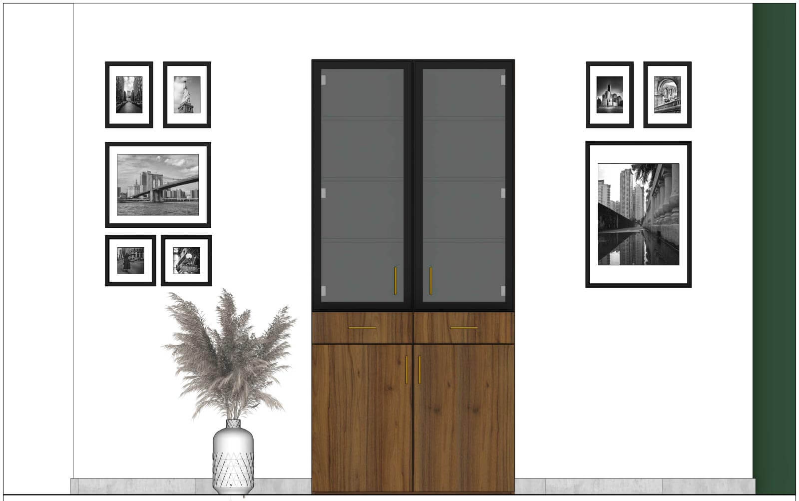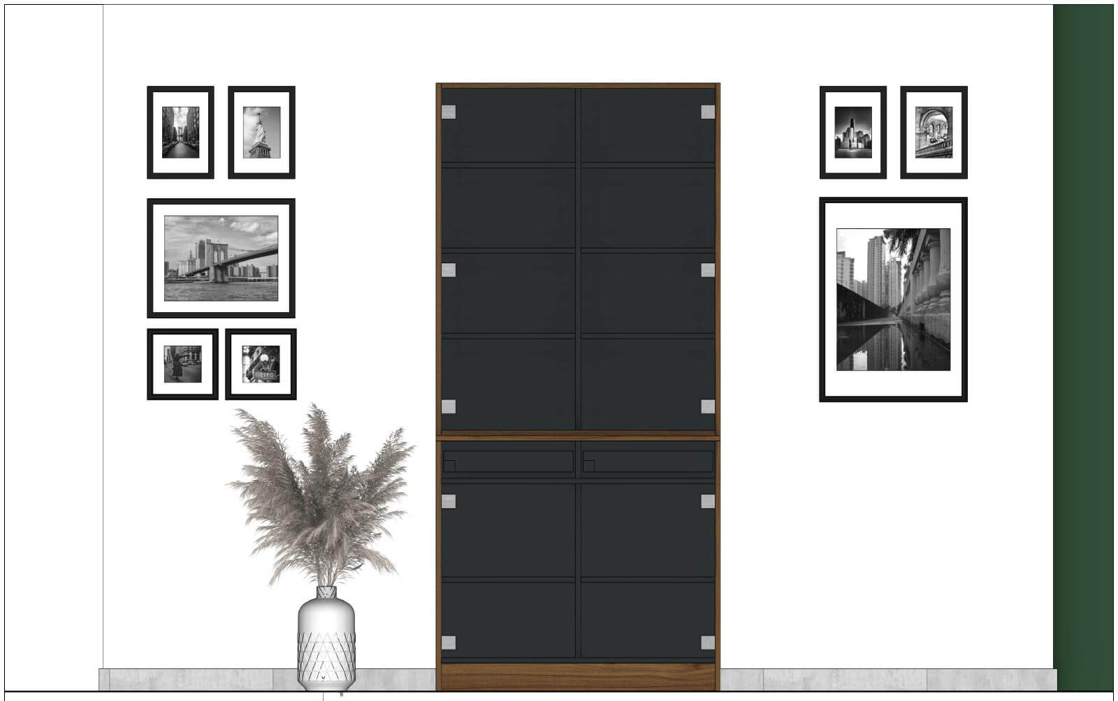 Lorsque nous avons rencontré la première fois notre client dans son appartement à Hesperange, il s’agissait d’aménager une partie de la pièce principale. D’une belle surface, non cloisonnée, celle-ci court de l’entrée jusqu’à une cuisine moderne ouverte, déjà en place. Le volonté prioritaire est de formaliser l’entrée avec un claustra pour la marquer visuellement et la séparer du salon. Une grande armoire fait également partie de cette première phase.