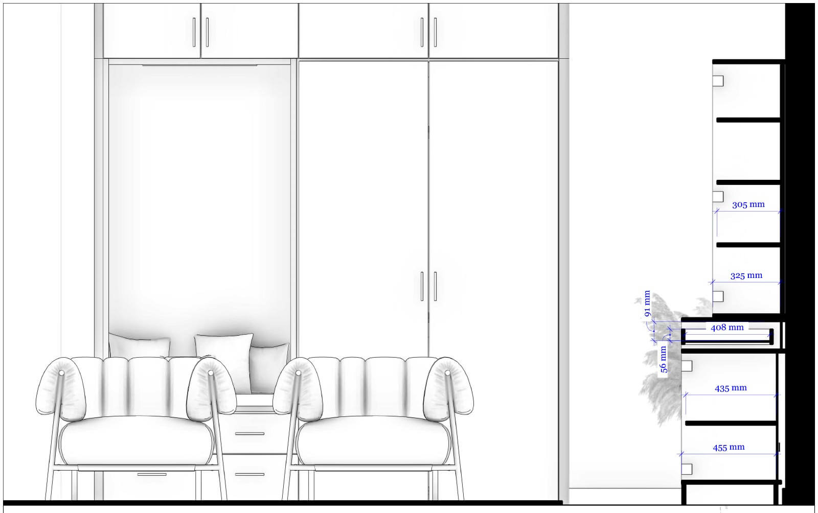 La cuisine étant déjà en place, la grande pièce living de cet appartement à Hesperange peut s’imaginer de diverses manières. Pour les deux phases du projet, le dialogue entre l’architecte d’intérieur et le client a permis de beaucoup préciser les intentions et d’éviter la conception inutile de propositions d’aménagement. La confiance, l’écoute, les rendez-vous ponctuels, ont rassuré le client tout au long du projet. Des mesures précises sont indiquées à travers des plans de coupe comme ci-dessous.