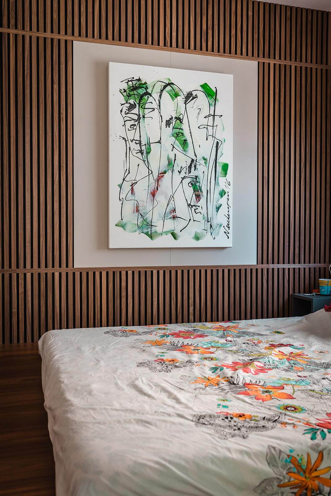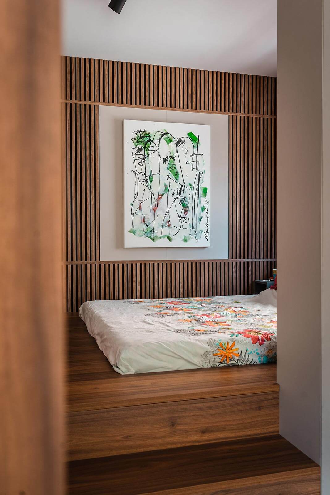 L’aménagement sur mesure ouvre des possibilités infinies. L’idée de cette chambre est le résultat de réflexion de notre architecte d’intérieur qui est allé au-delà de la réponse convenue. En rehaussant le sol, il réduit la hauteur de la pièce et crée une intimité nouvelle. Les murs habillés de bois tout en laissant la place à l’art combinent esthétique et sensation.