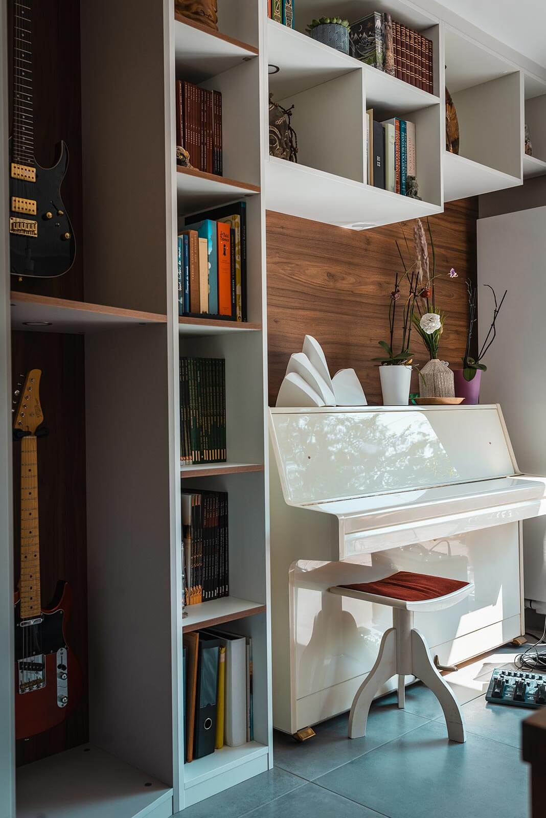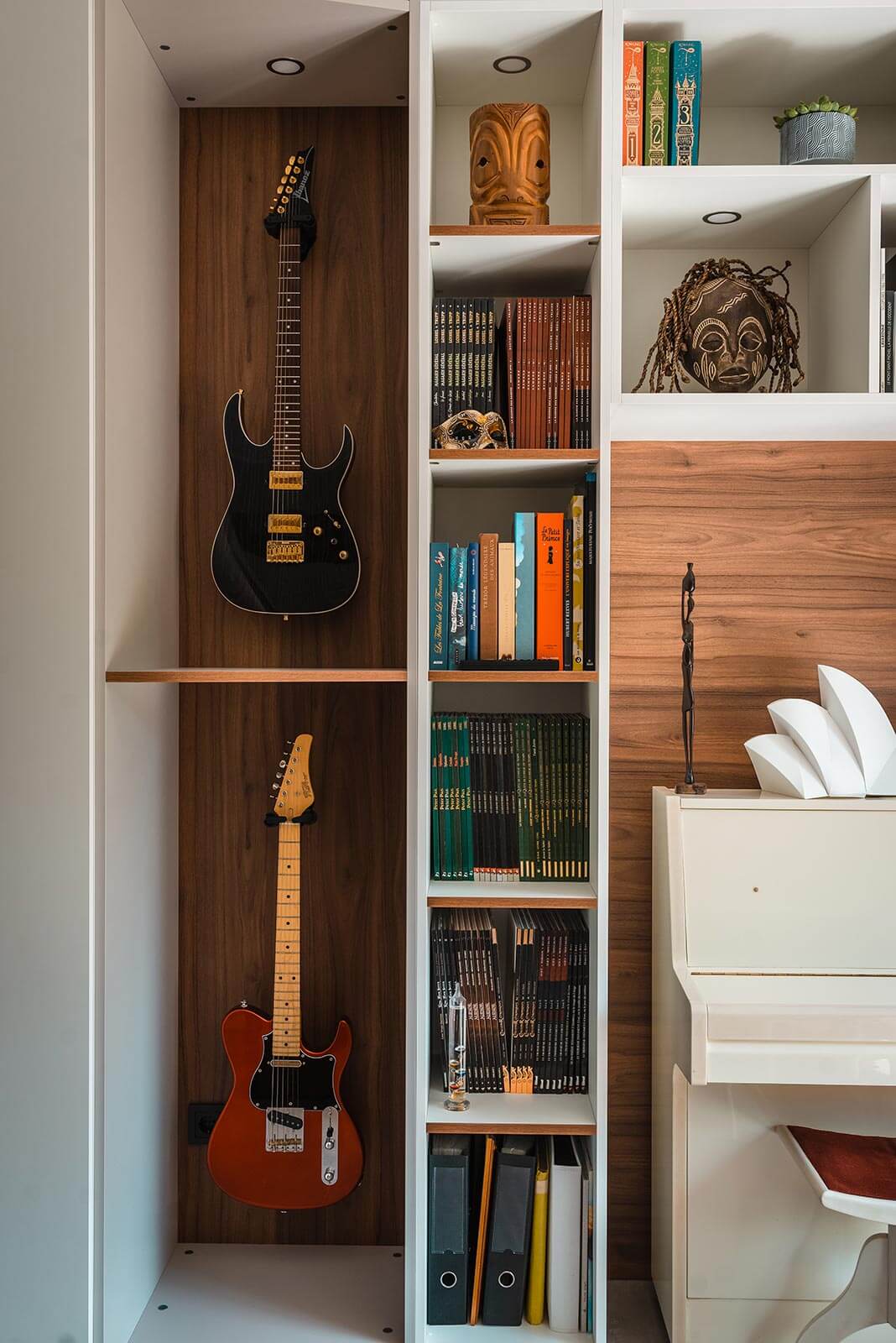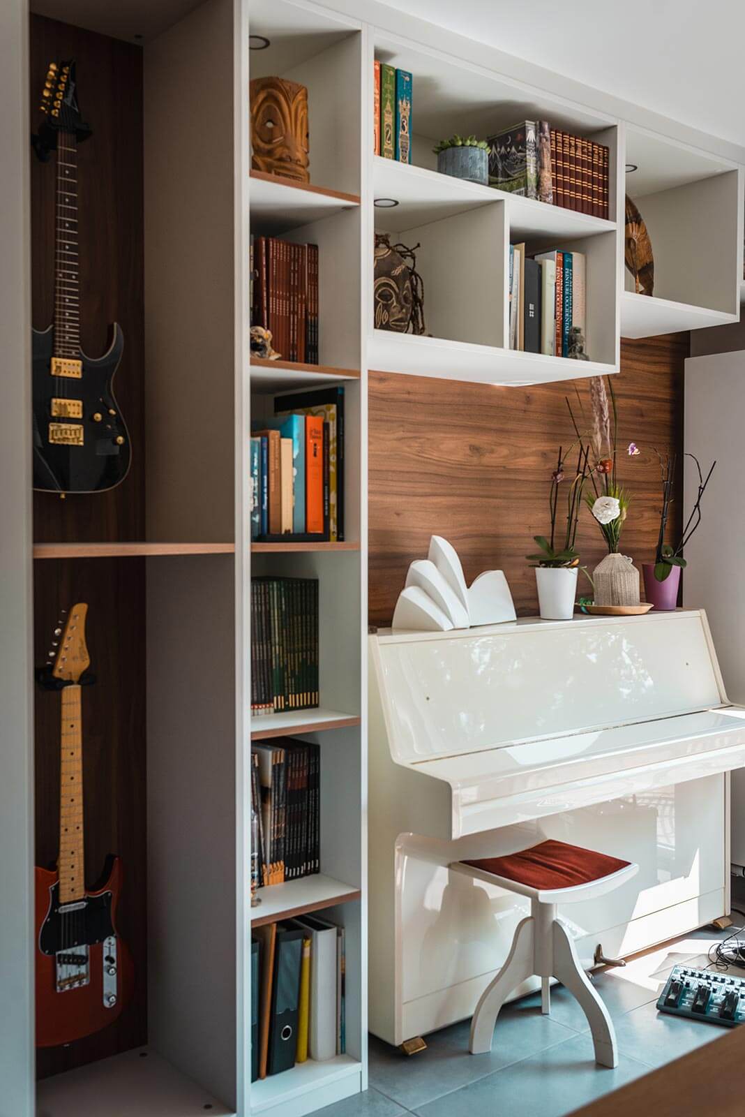 Désormais, tous les objets importants trouvent leur place et sont valorisés. Les bandes dessinées, les beaux livres, et même la guitare et le piano se côtoient dans un meuble mural sur mesure. Une place méritée qui évite de les abîmer et qui les sublime.