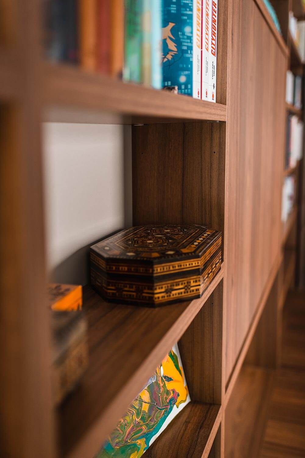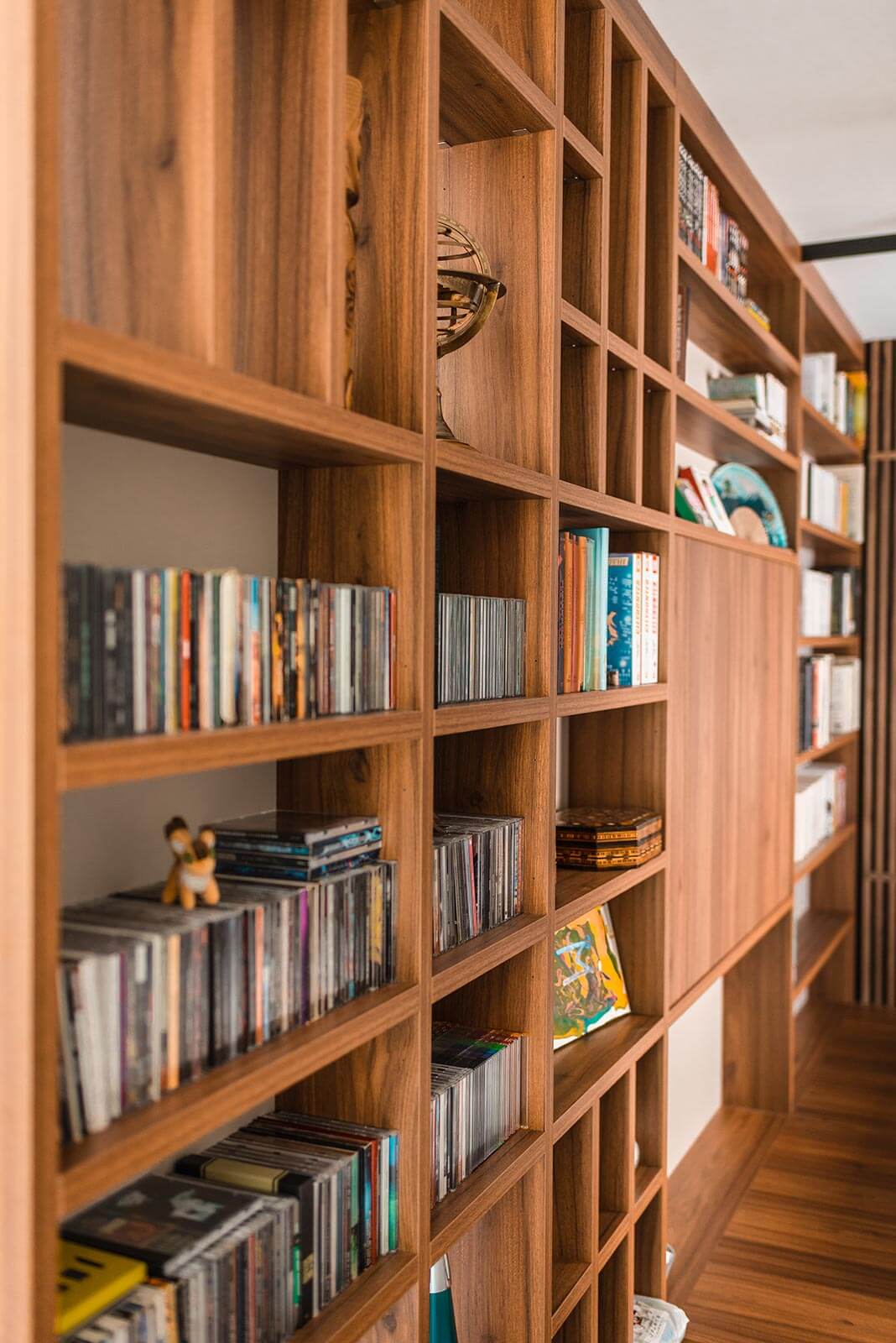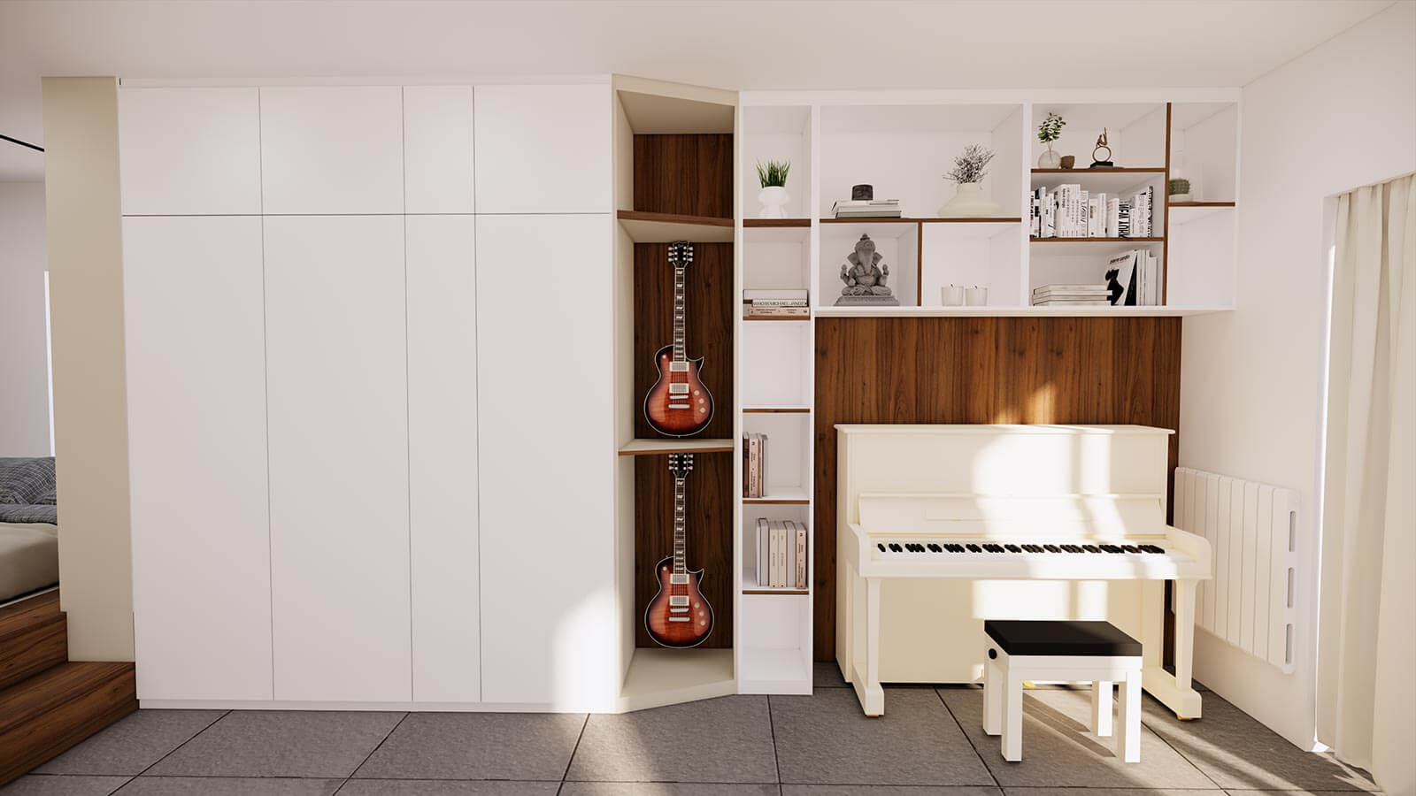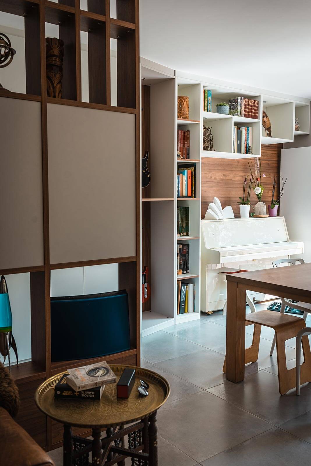 Désormais, tous les objets importants trouvent leur place et sont valorisés. Les bandes dessinées, les beaux livres, et même la guitare et le piano se côtoient dans un meuble mural sur mesure. Une place méritée qui évite de les abîmer et qui les sublime.