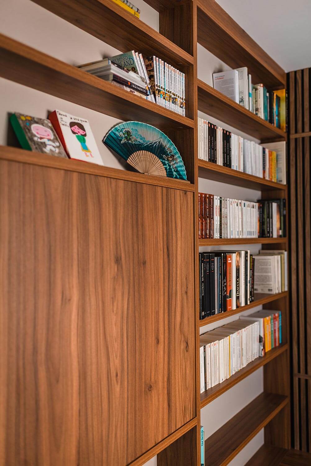 Deux marches créent un dénivelé léger mais tellement chic. Une idée simple mais qui donne l’impression de changer de lieu. Une sensation de séparation sans cloison, rappelant à nos clients des voyages en Asie. Un cocon chaleureux à deux pas du salon, fait de lattes de bois habillant tout un mur et de meubles regroupant les lectures passées et à venir.