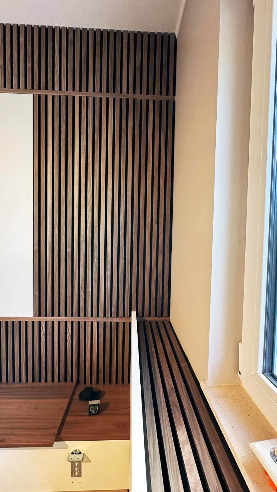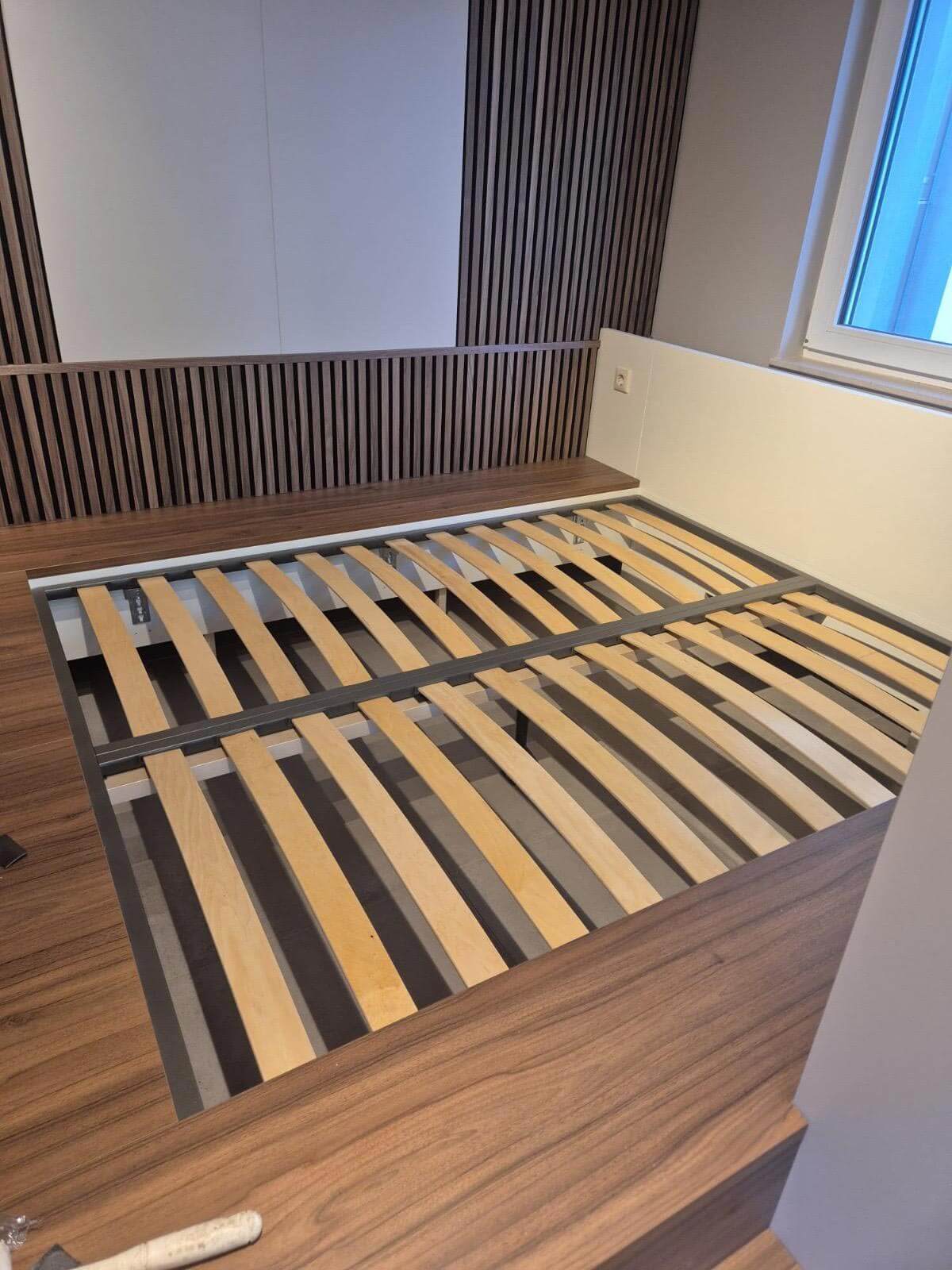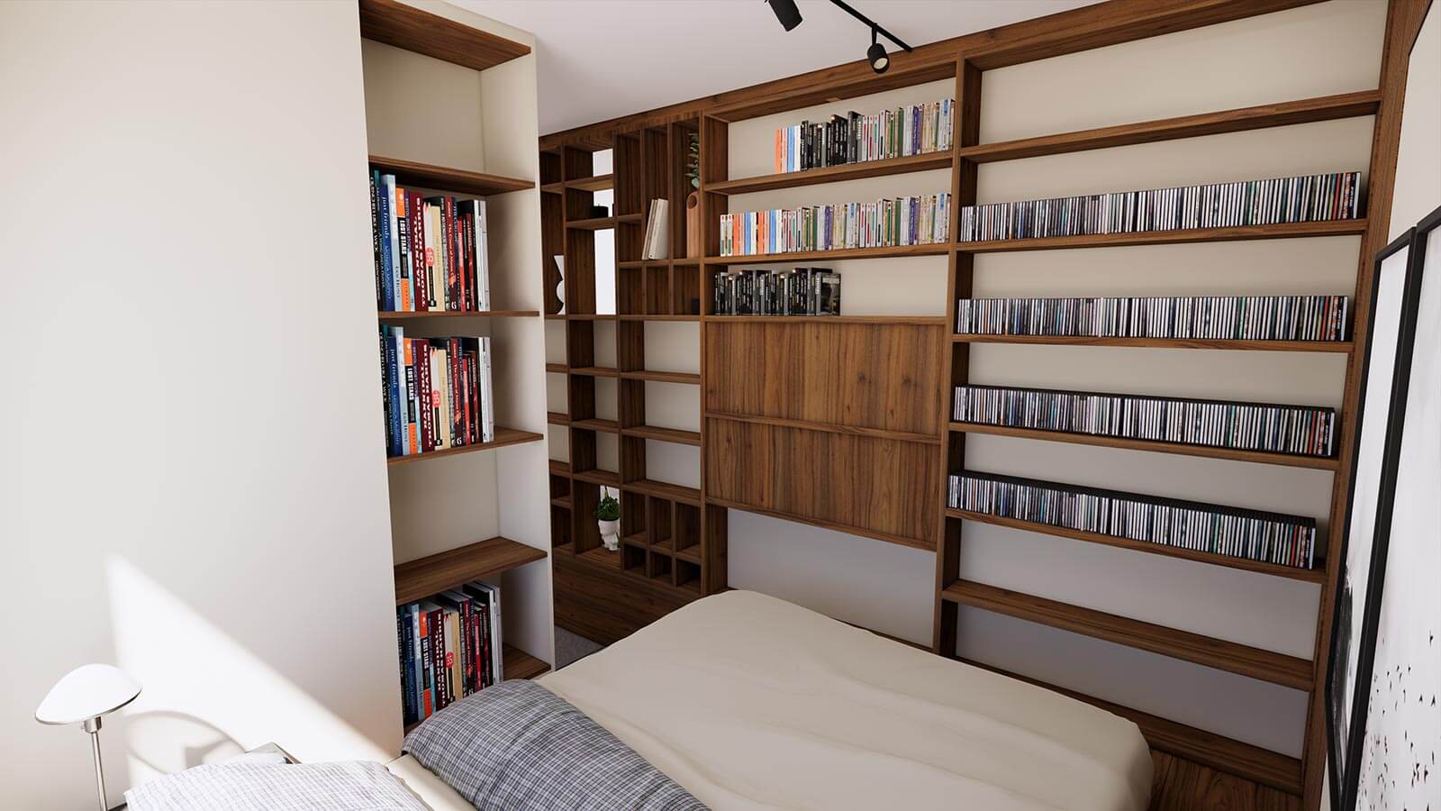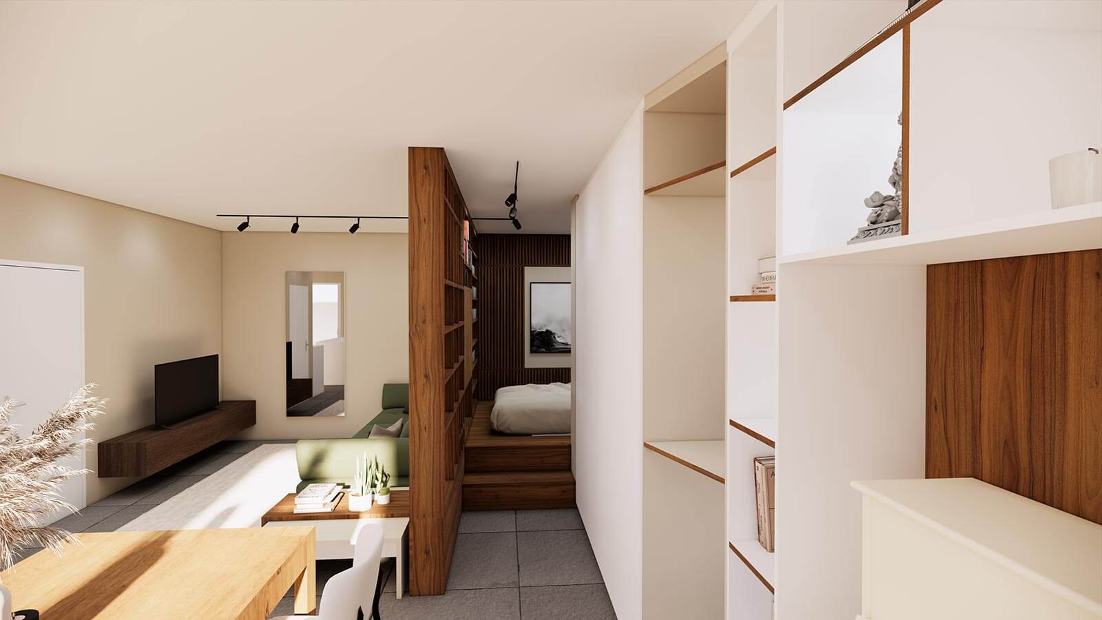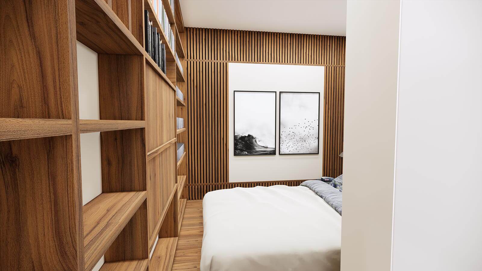 C’est assez rare pour le signaler, la surface entière de la petite pièce attenante au salon a été exploitée pour devenir un espace mobilier total. Le sol, qu’on atteint grâce à deux marches, s’est vu rehaussé pour accueillir un sommier intégré qui place le matelas au niveau du plancher. Les murs sont habillés d’étagères, claustra et lattage acoustique.