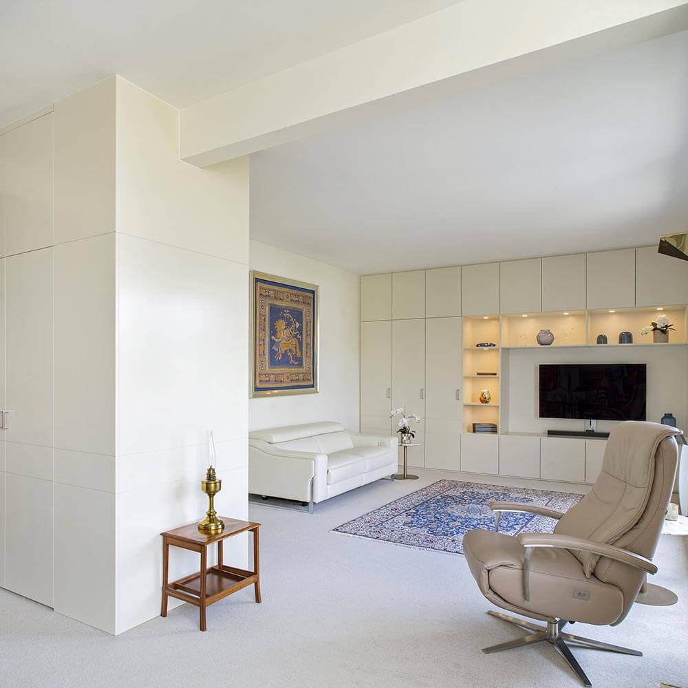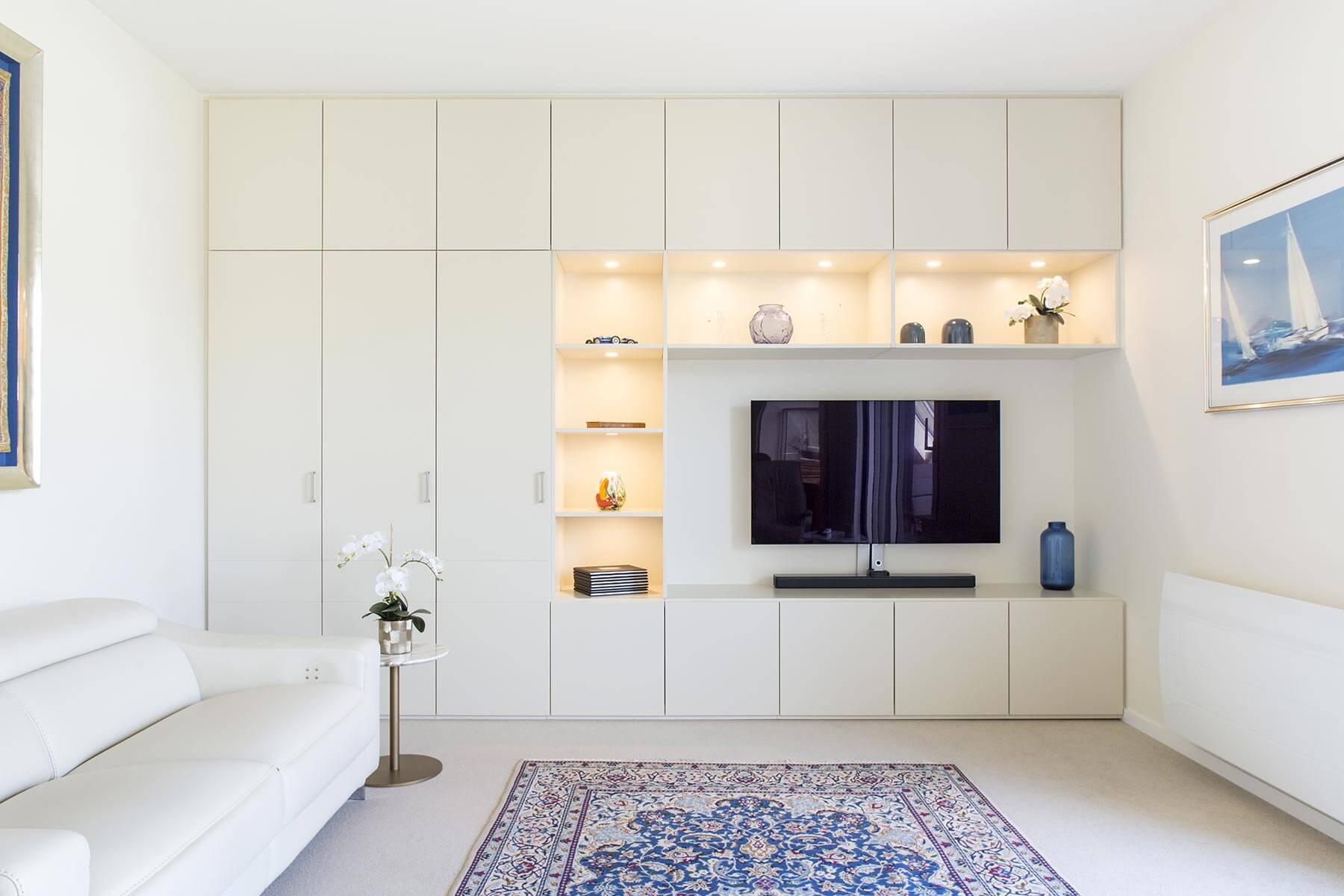 Ce Meuble TV sur mesure beige clair a été imaginé, réalisé et posé par BeHome Interiors à Genève dans le cadre d’une rénovation intérieure complète d’un appartement. Des travaux importants sont nécessaires pour repenser entièrement la belle surface totale. Nous supervisons le chiffrage et l’ensemble du chantier et déléguons, en amont de l’aménagement, le gros œuvre à notre partenaire travaux. Focus sur le meuble TV qui va habiller tout un mur.