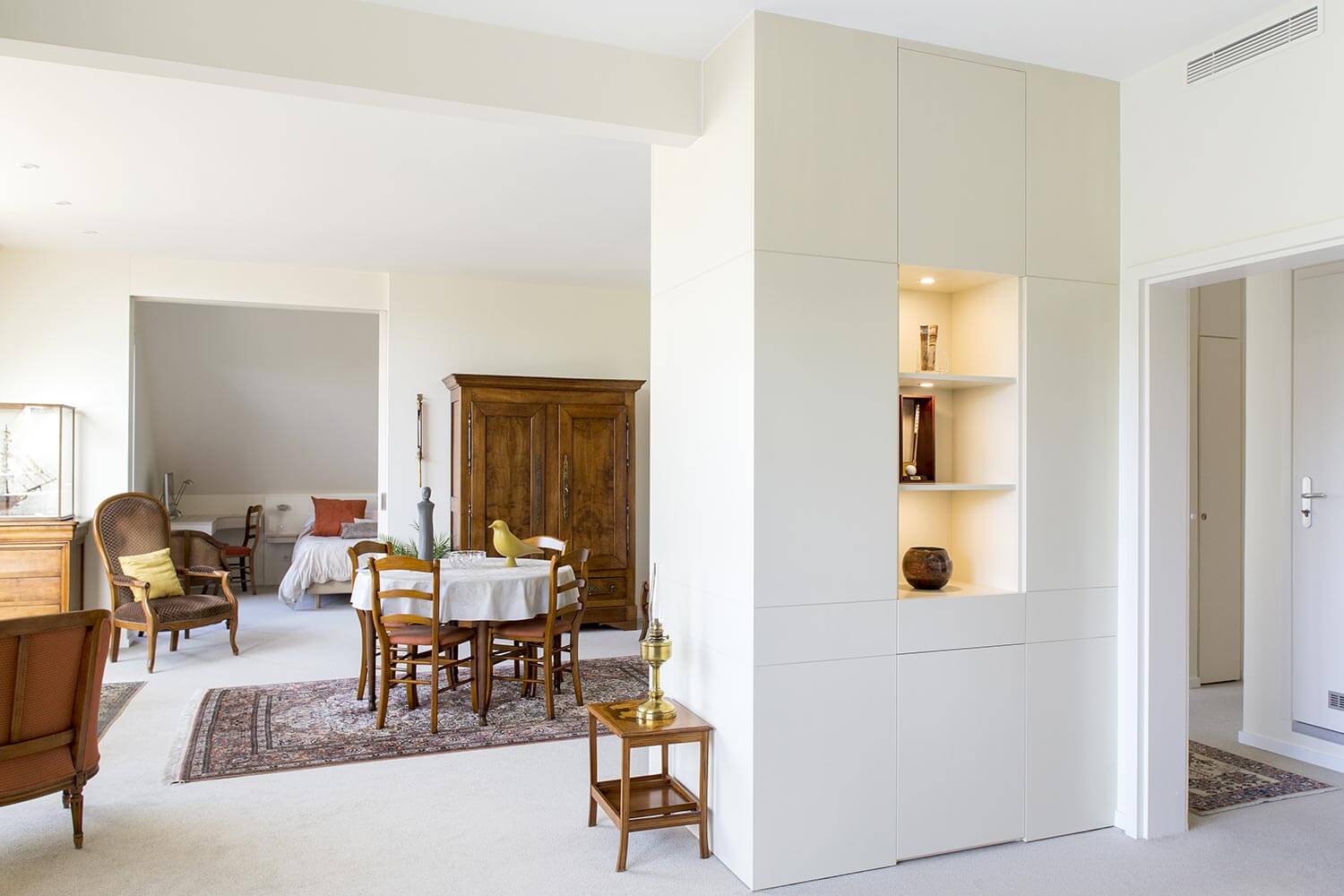Entre les deux espaces Salon et Séjour, pas de cloison qui couperait la lumière mais un meuble toute hauteur entourant un pilier central pour le faire disparaitre et créer des rangements supplémentaires. Une niche éclairée répond comme un écho architectural au meuble TV. L’aménagement global et ouvert permet de réfléchir une surface généreuse comme un tout. Les meubles plus « rustiques » de nos clients ne sont en aucun cas écrasé par le design contemporain et imposent leurs belles courbes.