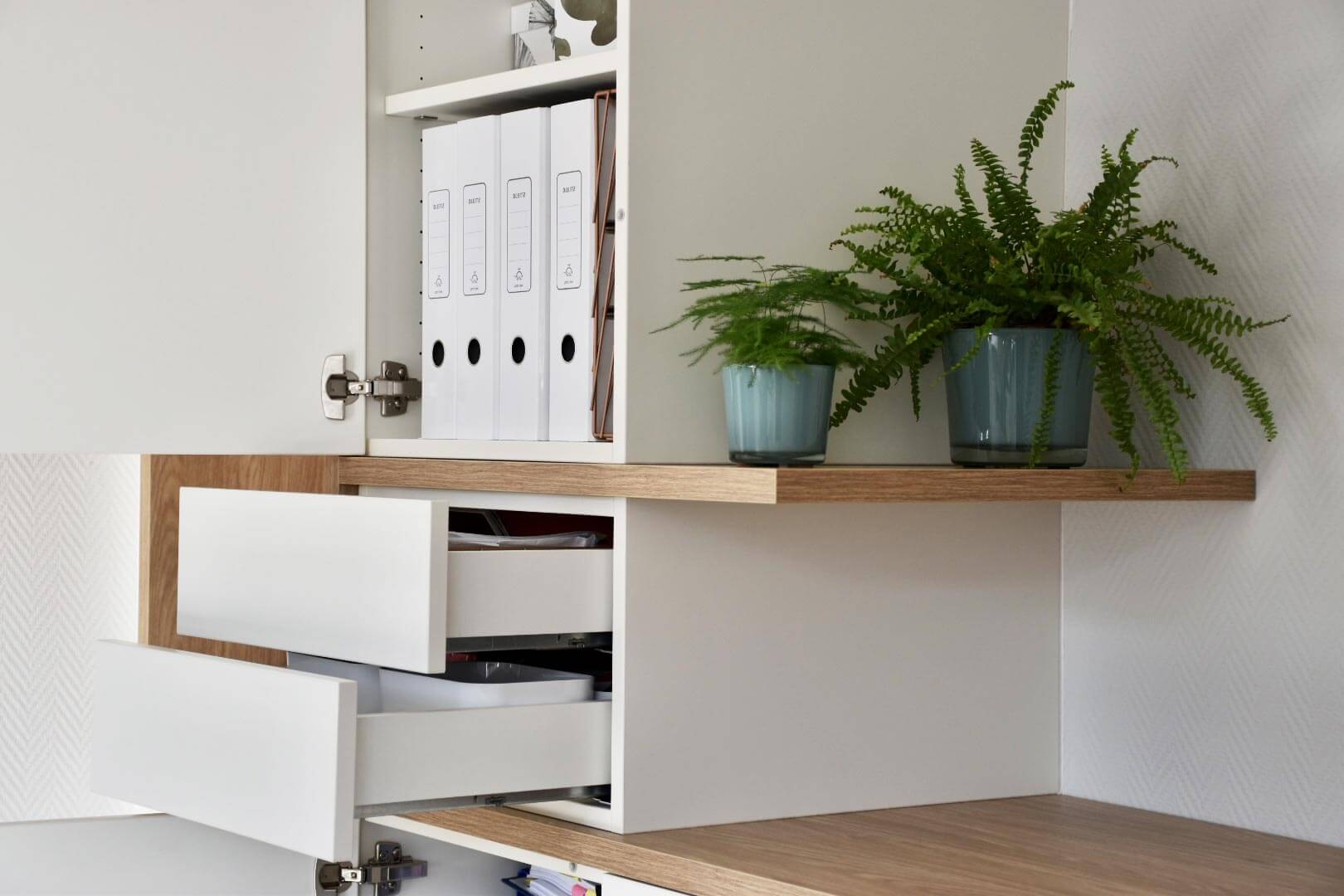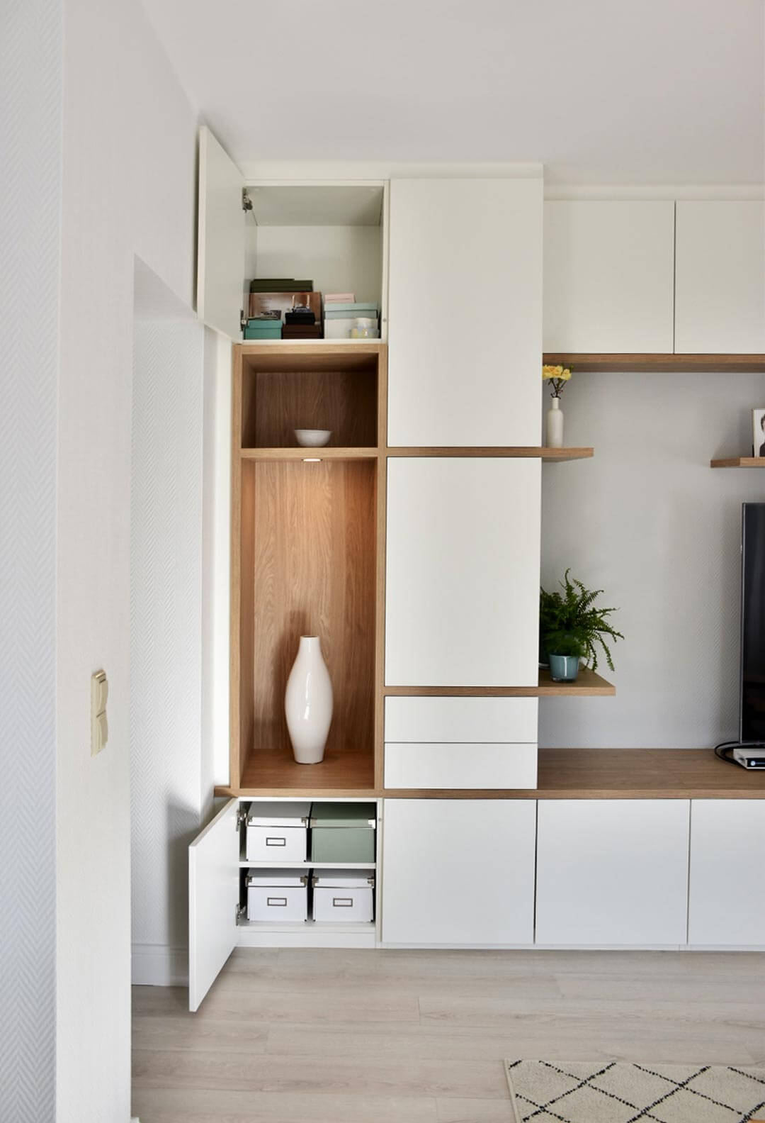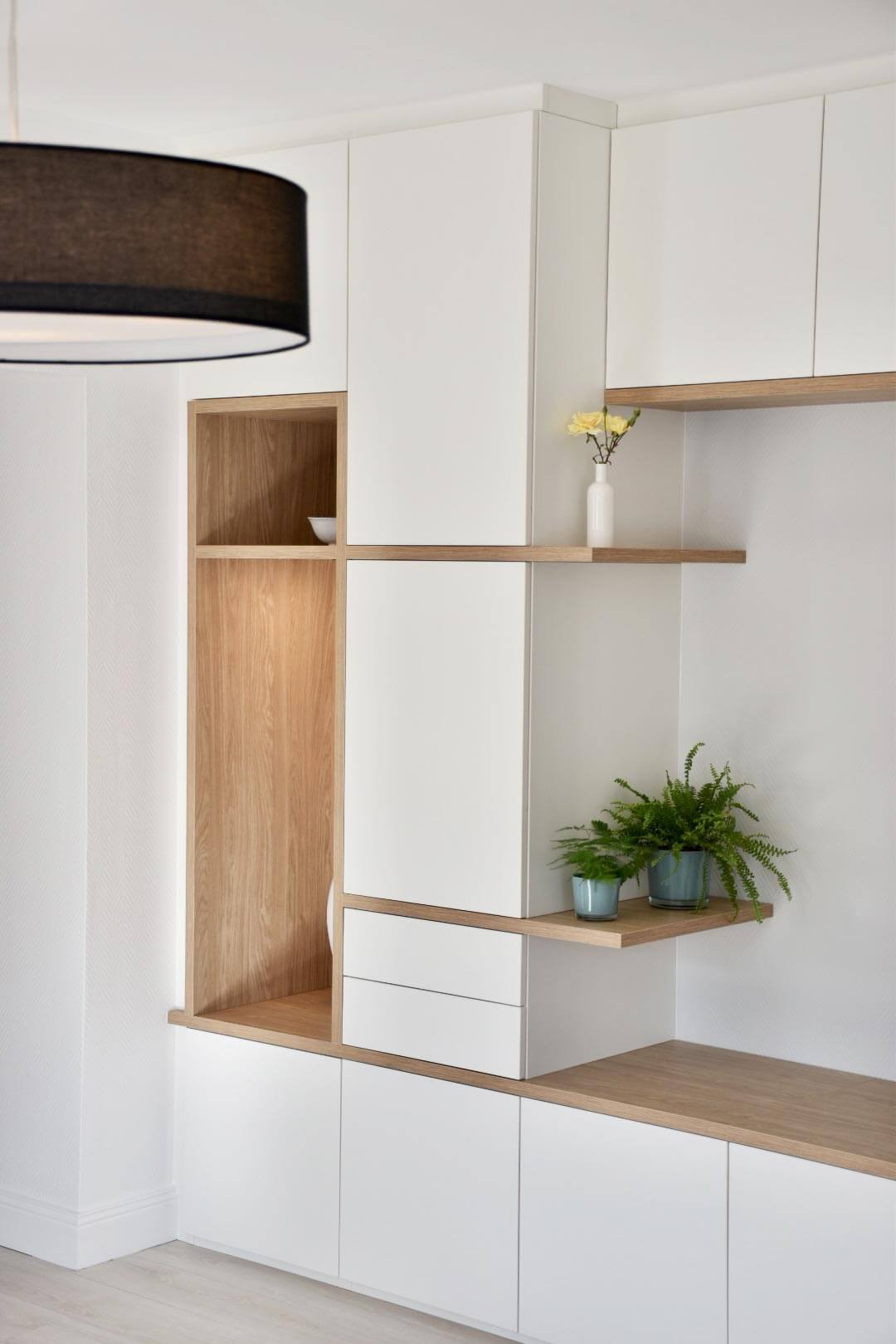 Entrecoupées de pans horizontaux en mélaminé chêne clair, les façades sont délimités de manière affirmée et leurs dimensions variables évitent la monotonie. Comme un code couleur naturel, le bois invite à la décoration, aux plantes. La niche a été réalisée très haute pour accueillir plus tard une ravissante sculpture. Les verticales et les horizontales créent presqu’une impression de mouvement avec ces décalages de plans très réussis.