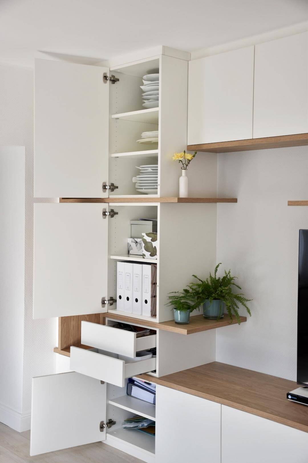 La partie gauche du meuble TV sur mesure offre elle aussi de beaux volumes de rangement. Les façades en mélaminé blanc mat sont élégamment discrètes et cachent des logements nombreux et variés pour la vaisselle, les archives Portes et tiroirs sans poignée intègrent un système en push-lash, permettant d’une simple poussée leur ouverture.